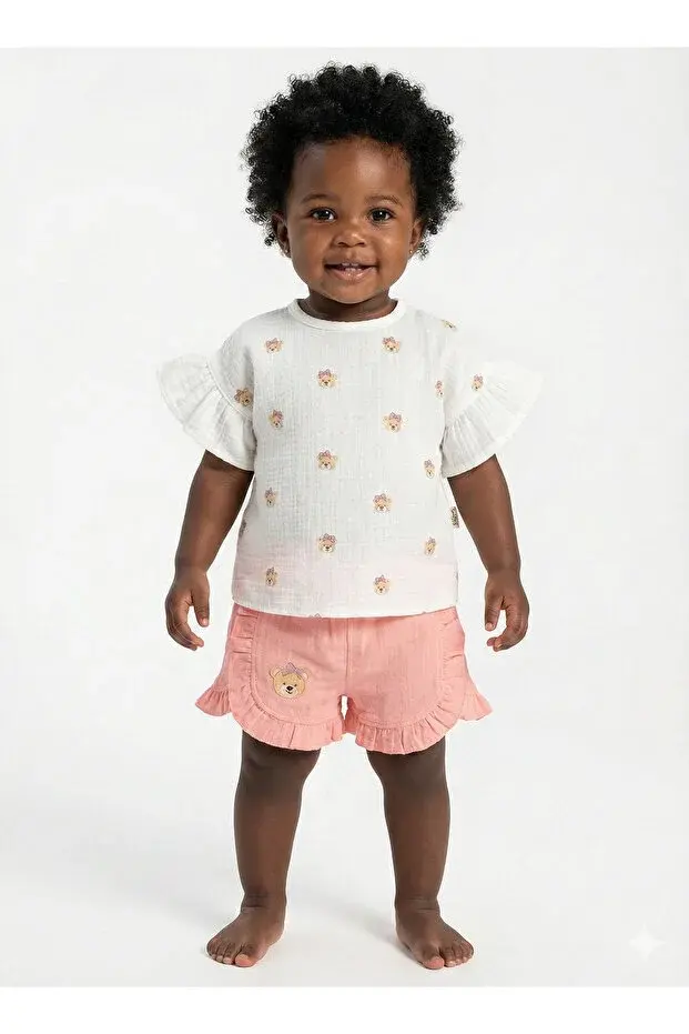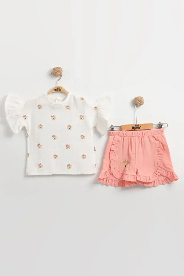 Ayıcıklı Müslin Kız Bebek Şortlu Takımı Seti %100 Pamuk 9-12-18 Ay 2-3-4-5 Yaş Seri - 938-Pembe