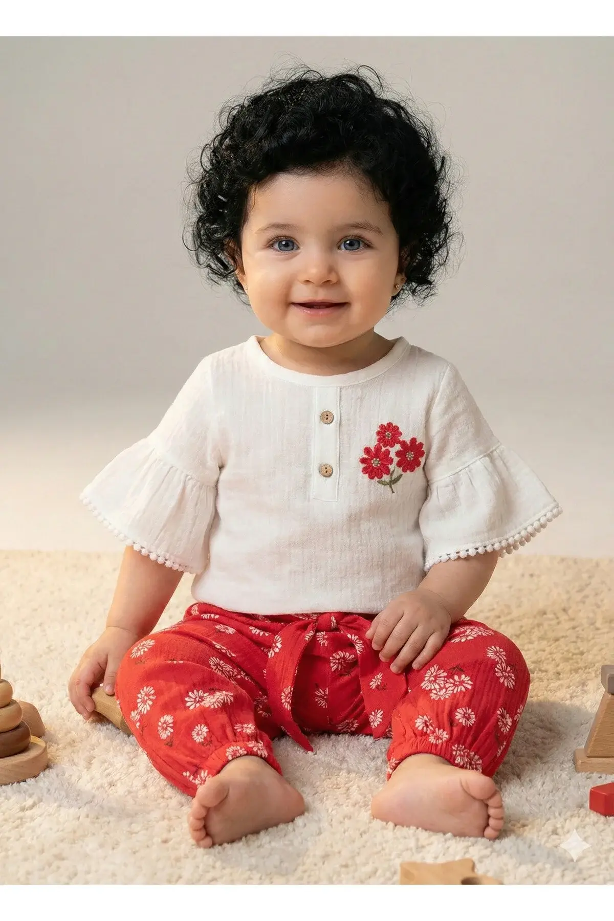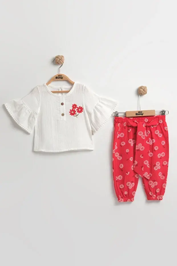 Çiçekli Müslin Pantolonlu Kız Kırmızı Bebek Takımı %100 Pamuk (9-12-18 Ay)- Kırmızı