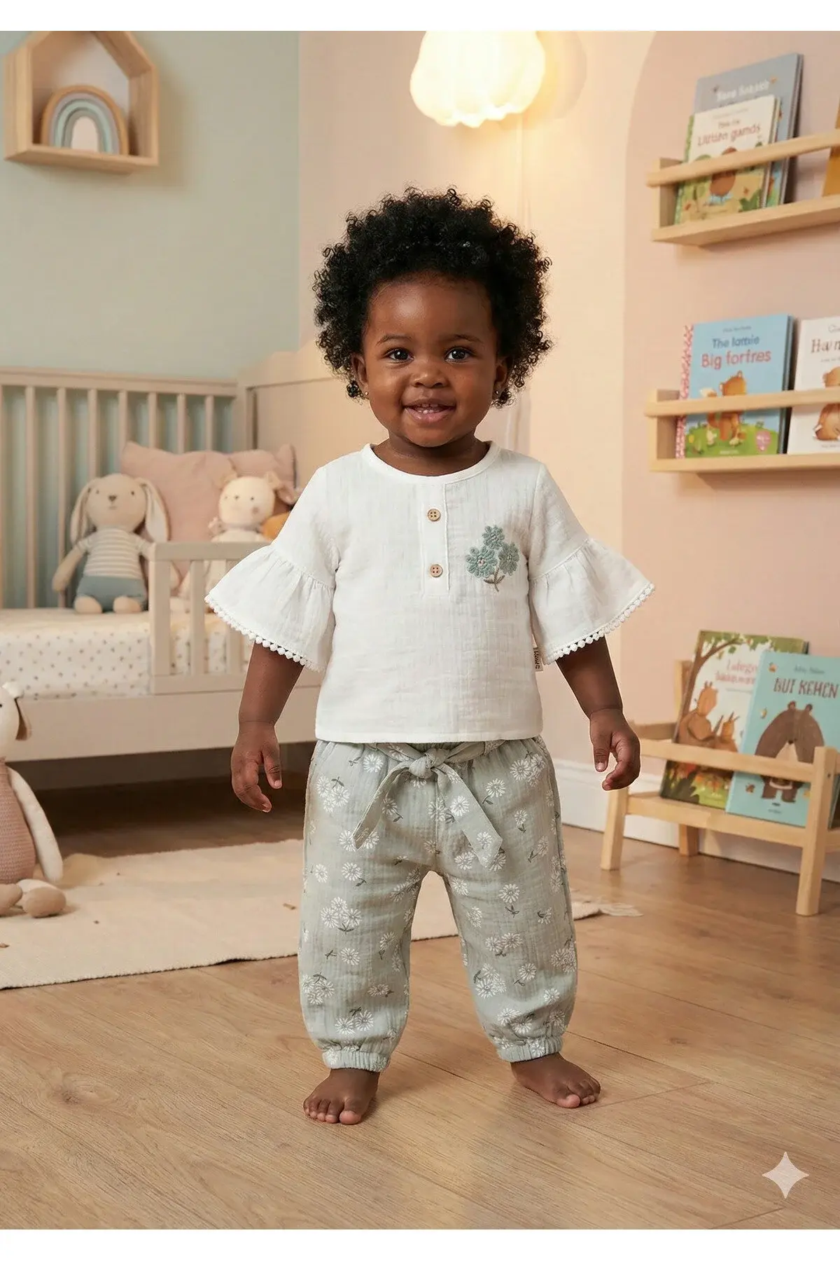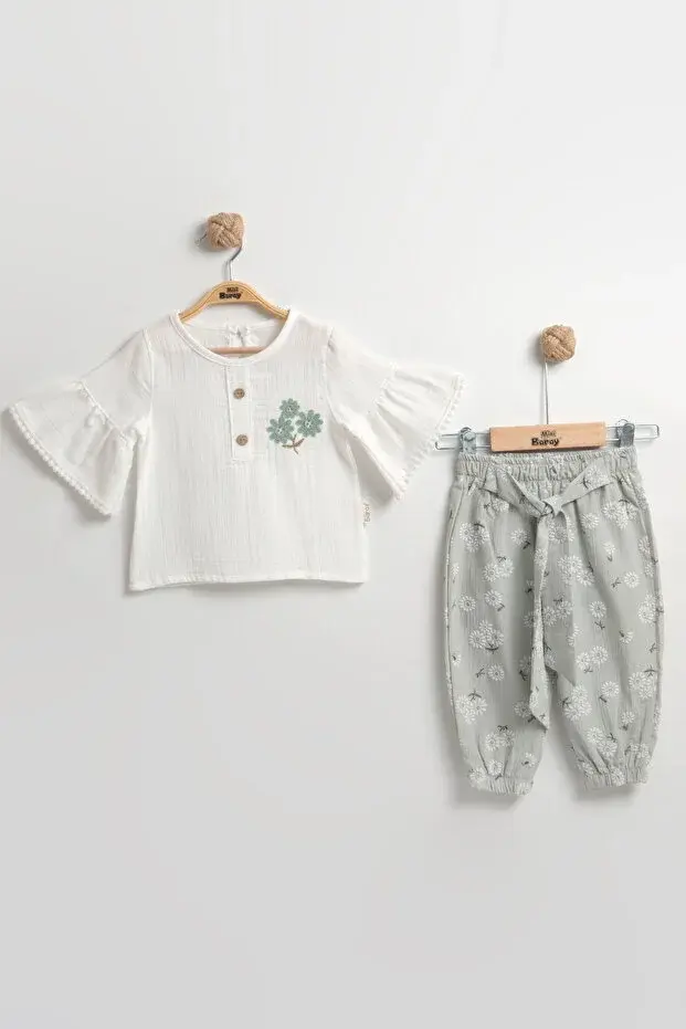 Çiçekli Müslin Pantolonlu Kız Yeşil Bebek Takımı %100 Pamuk (9-12-18 Ay)- Yeşil