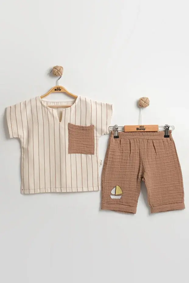 Çizgili Keten Gömlek+Şort Erkek Çocuk Yazlık Takımı (2-3-4-5 Yaş) - %100 Pamuk Müslin Kumaş Seri - 996-Kahverengi