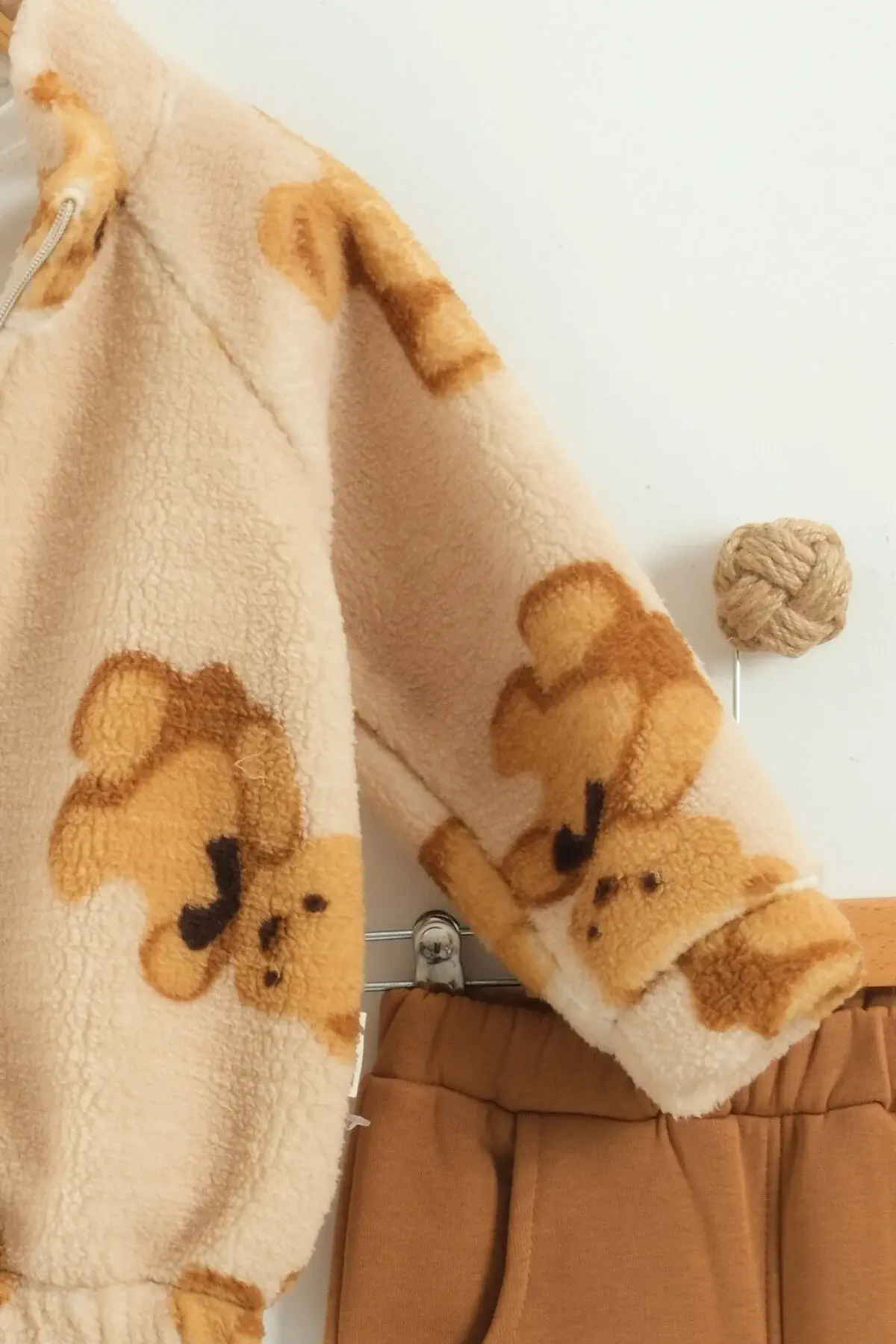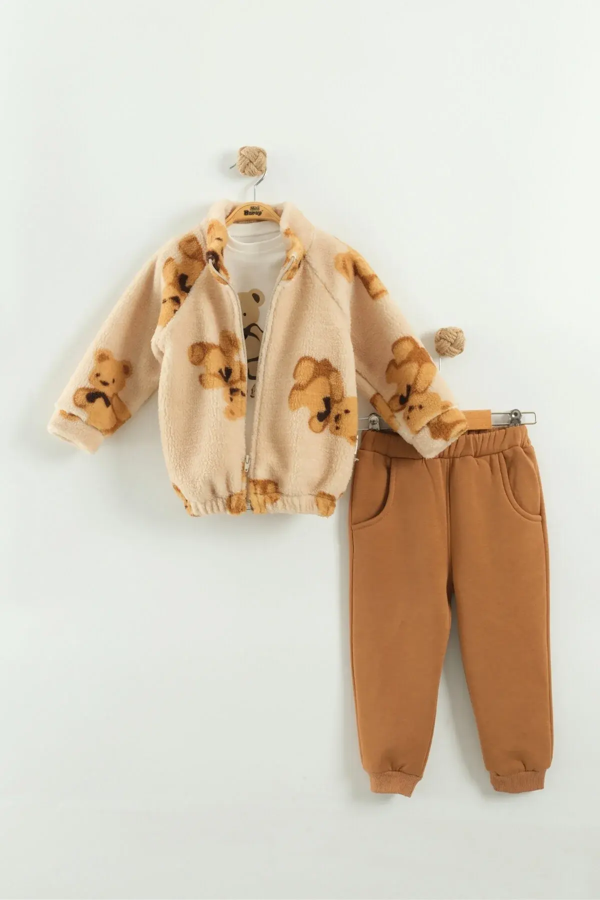 Çocuk Ayı Desen Peluş 3'lü Bej Peluş Eşofman Takım (2-3-4 Yaş)-Seri - 1023-Bej