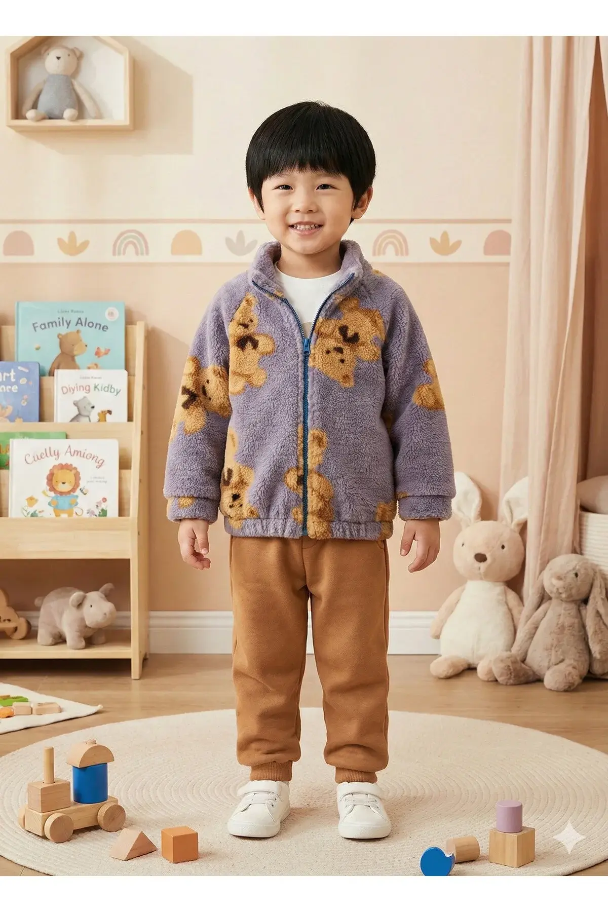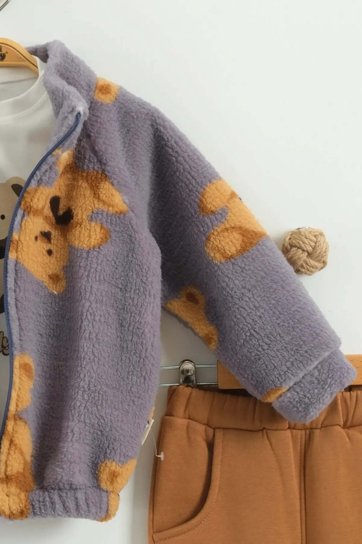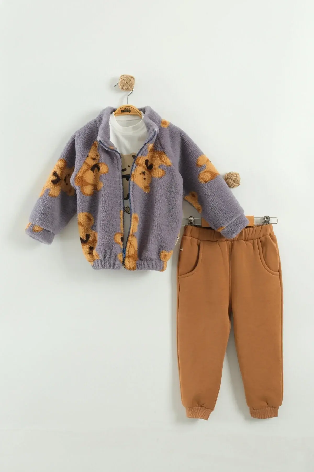 Çocuk Ayı Desen Peluş 3'lü Mor Peluş Eşofman Takım (2-3-4 Yaş)-Seri - 1023-Mor