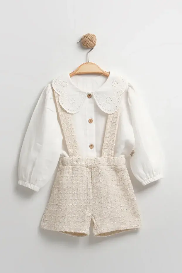 Dantel Yakalı Müslin Gömlekli Askılı 2'li Kız Bebek Takımı - Nefes Alan Kumaş (9-12-18-24 Ay ) Seri - 1053-Bej