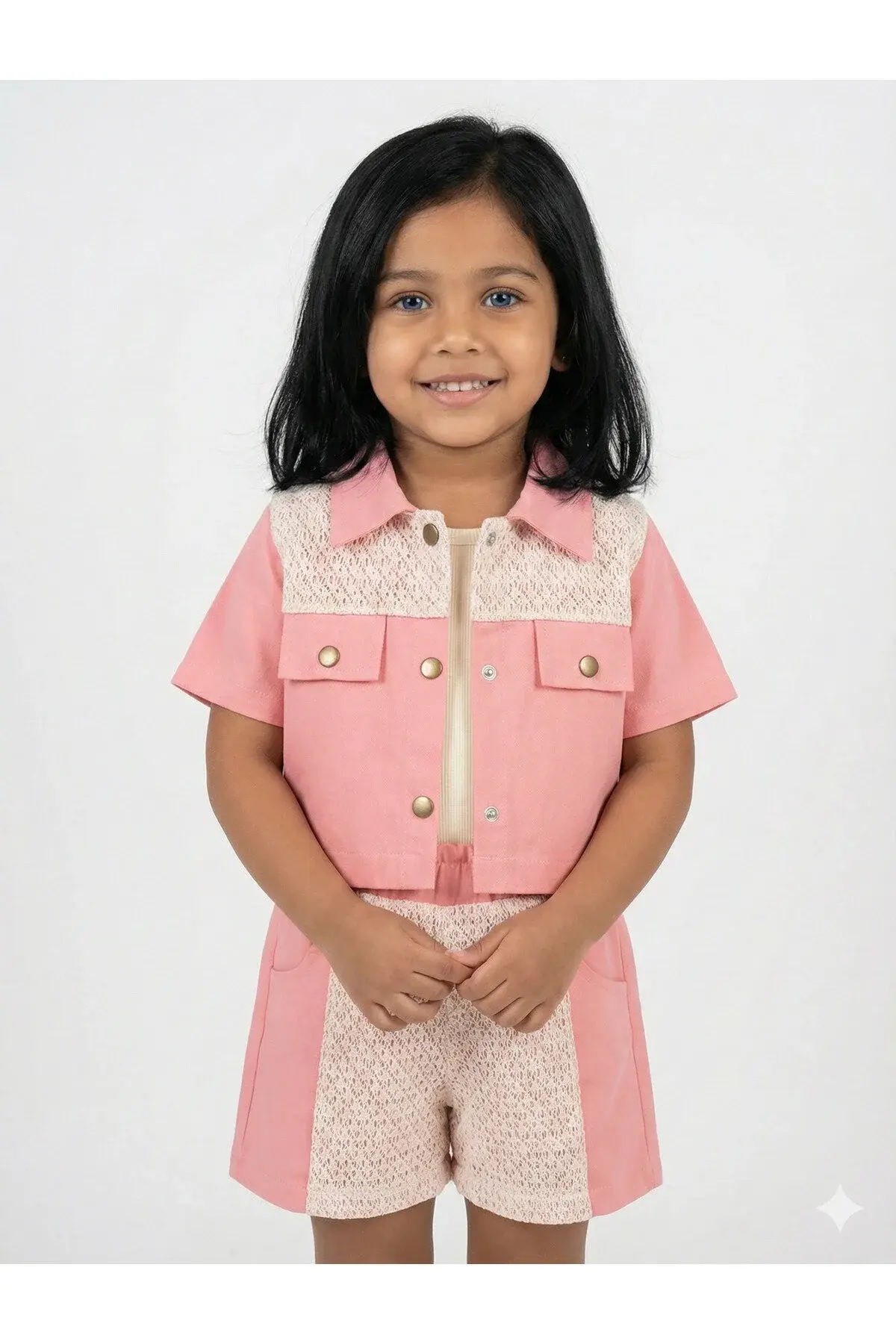 Dantelli Askılı Şortlu Gömlek Takım - 2,3,4,5 Yaş Kız Seri - 1065-Pembe
