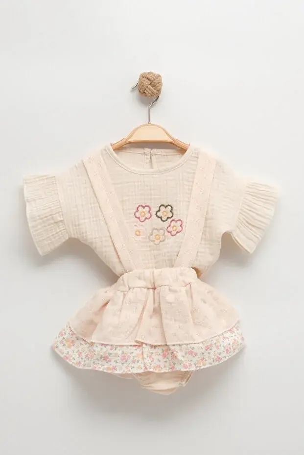 Desenli Müslin Etekli Takım - 9-12-18 Ay Kız bebek takım Seri -1066-Bej