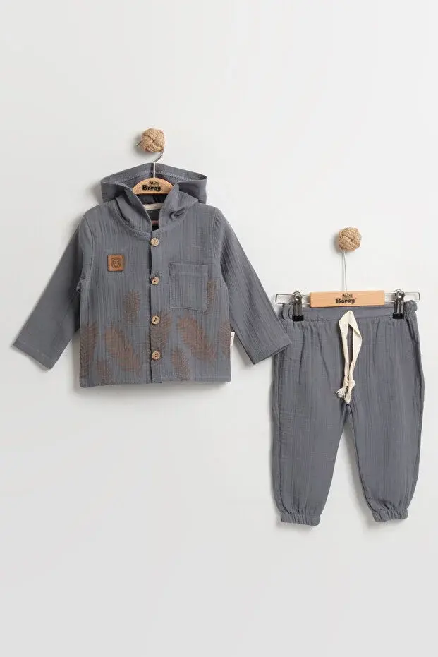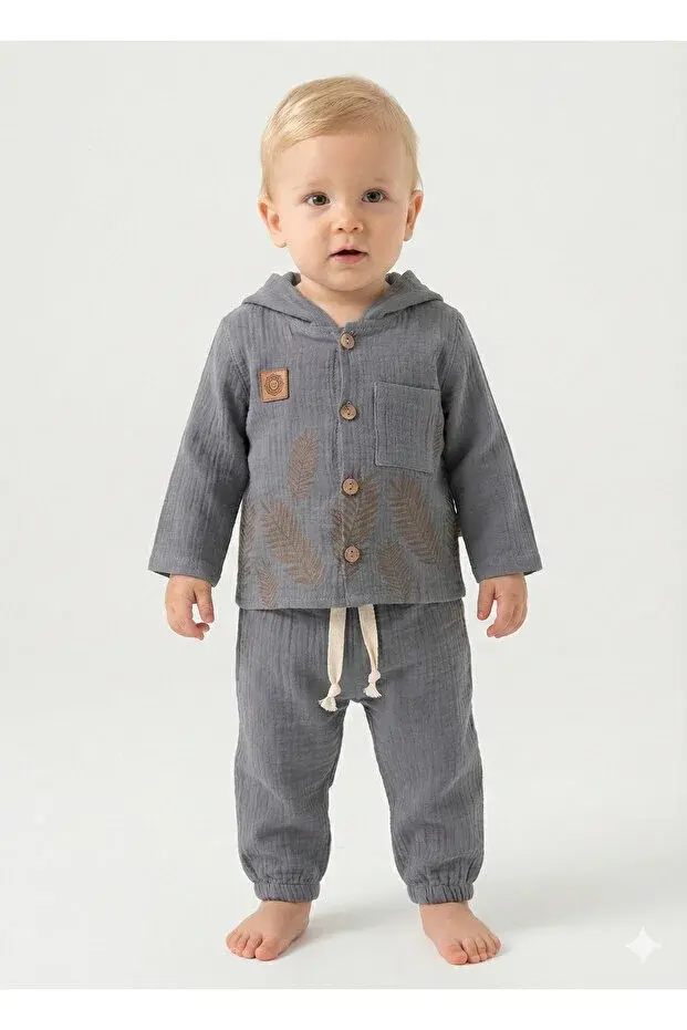 Doğal Yaprak Baskılı Uzun Kollu Bebek Gömlek Takımı 9-12-18 Ay - %100 Pamuk Müslin Yazlık Set Seri -990-Gri