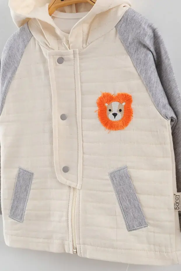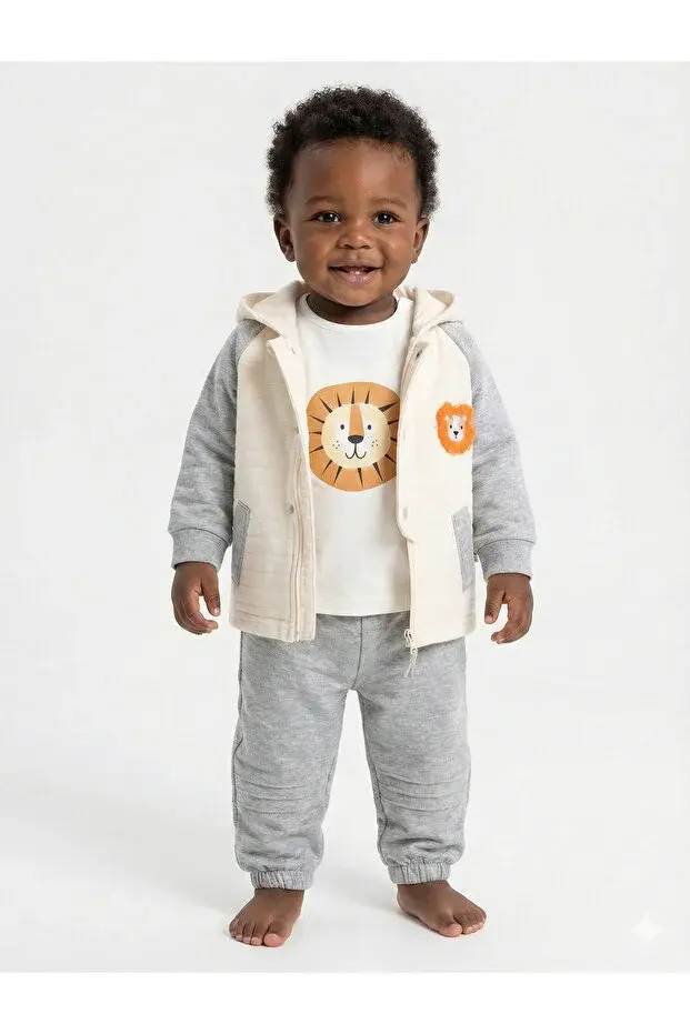 Erkek Bebek Aslan Nakış Ceket 3'lü Eşofman Takım (9-12-18-24 Ay) Seri - 1086-Gri
