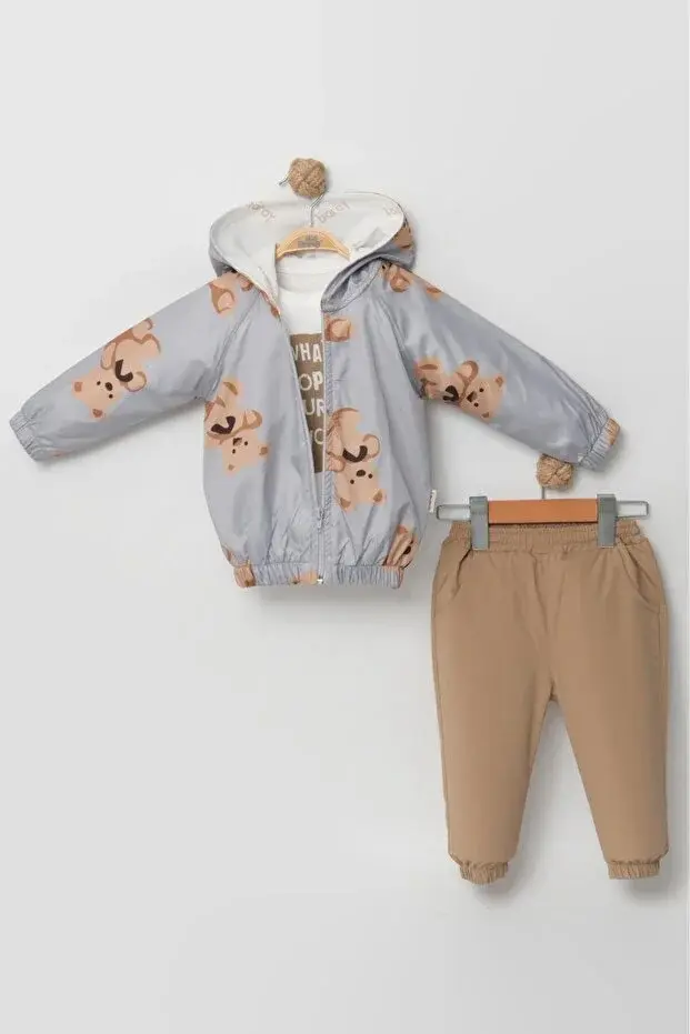 Erkek Bebek Ayı Baskılı Yağmurluklu 3’lü Pamuk Takım (9-12-18-24 Ay) - Renk Seçenekli Seri - 1046-Açık Mavi