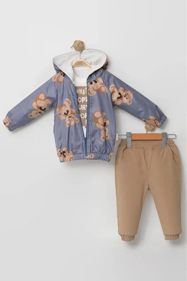 Erkek Bebek Ayı Baskılı Yağmurluklu 3’lü Pamuk Takım (9-12-18-24 Ay) - Renk Seçenekli Seri - 1046-Mavi