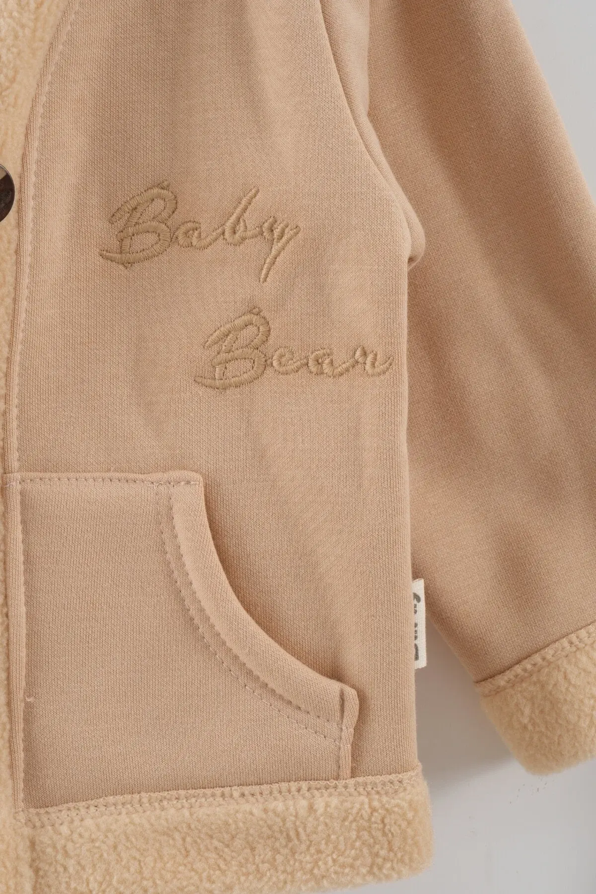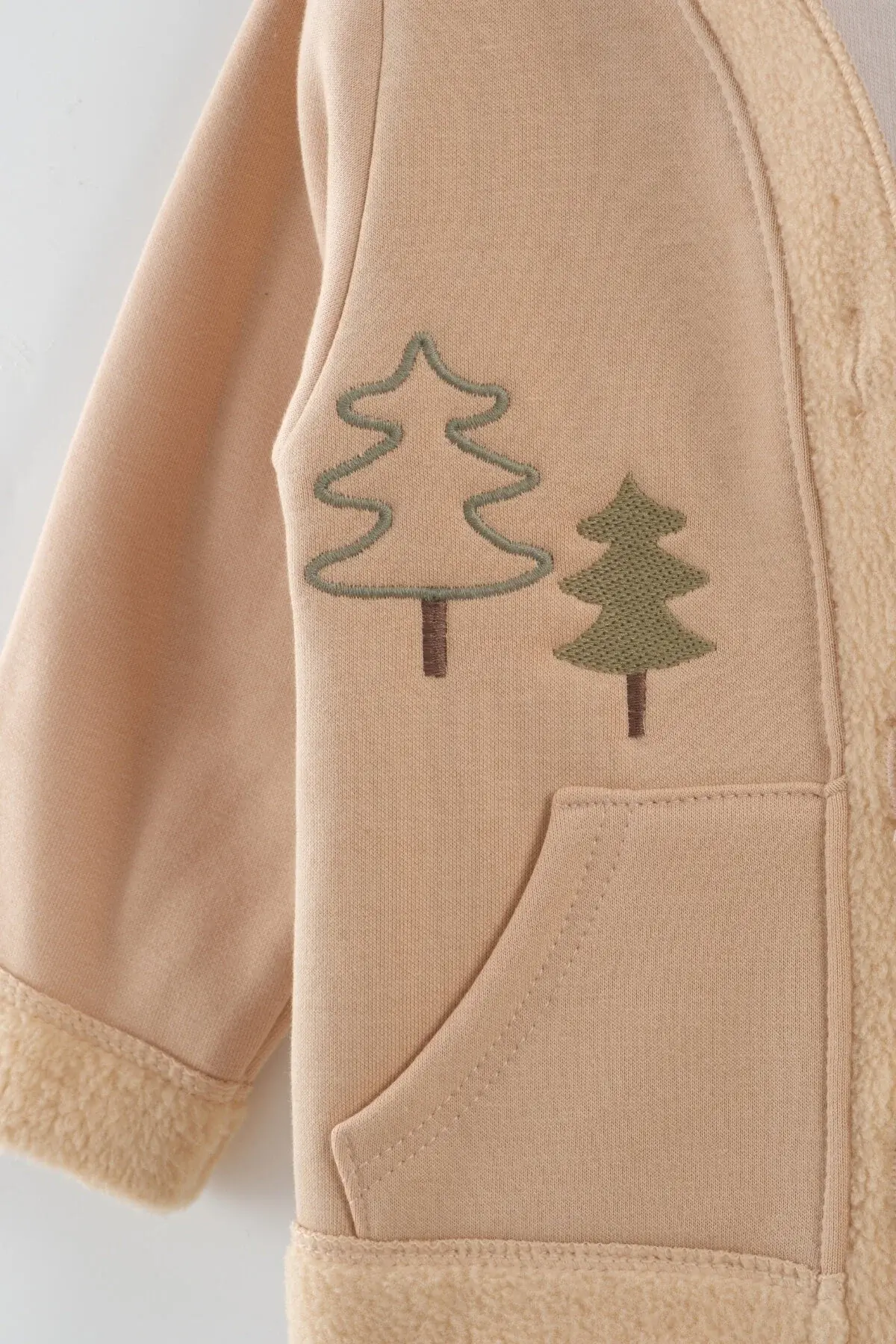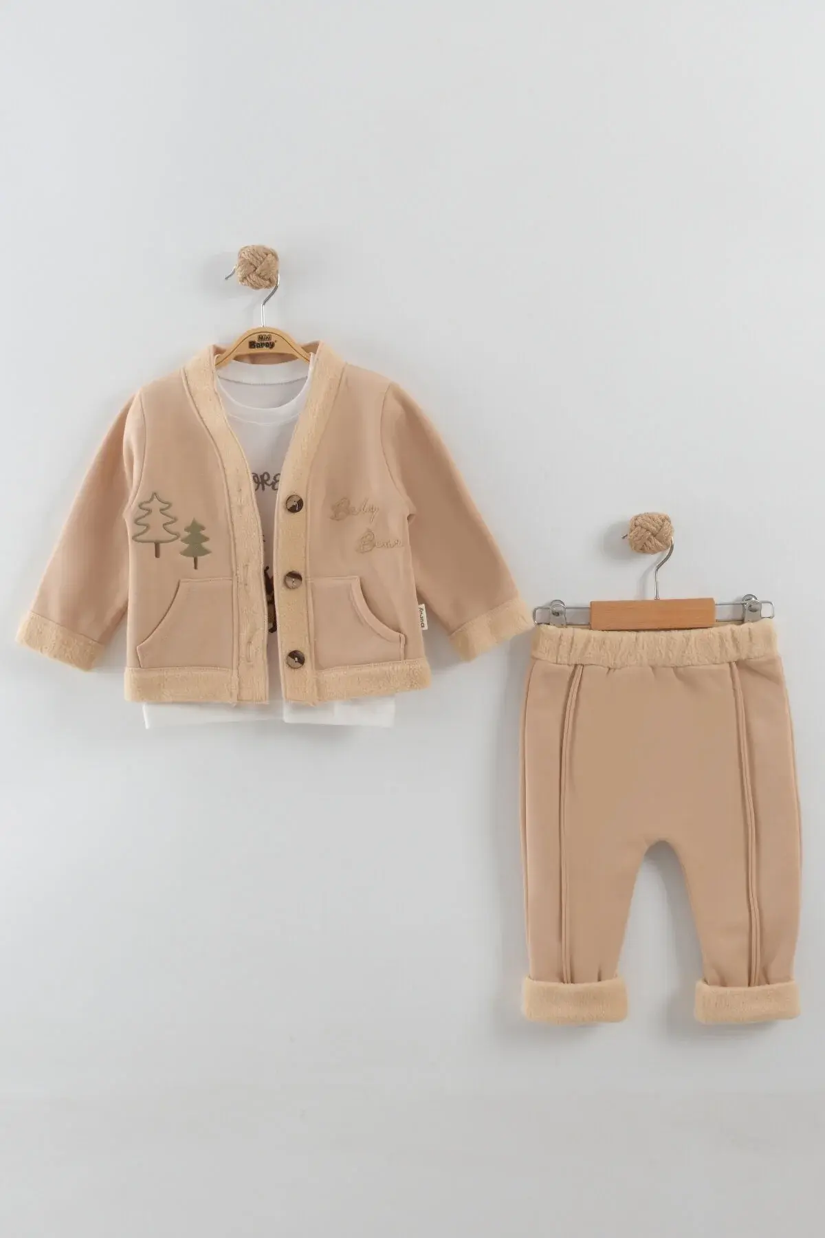 Erkek Bebek Çam Ağaç Nakışlı Bej Hırka Tişört Pantolon 3'lü Takım (9-12-18 Ay) Seri - 885-Bej