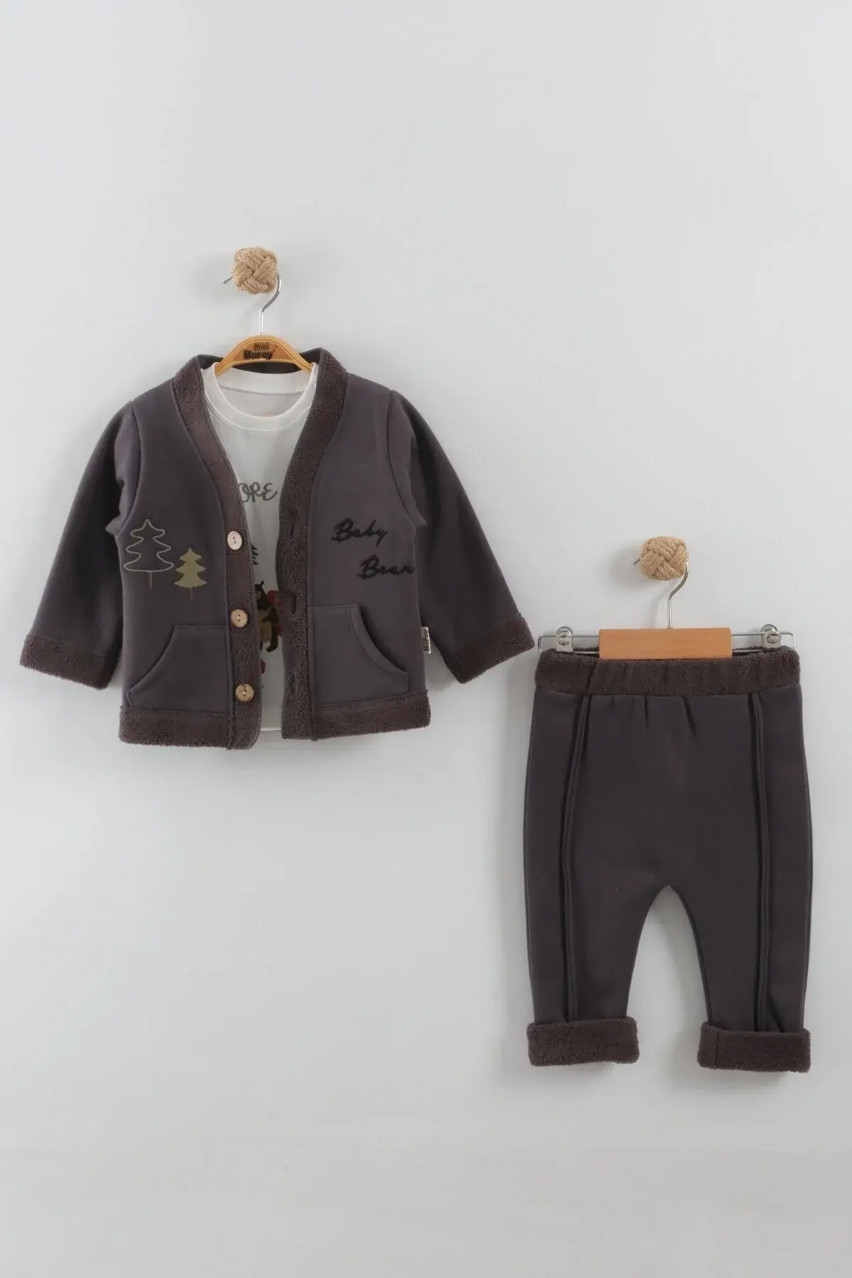 Erkek Bebek Çam Ağaç Nakışlı Füme Gri Hırka Tişört Pantolon 3'lü Takım (9-12-18 Ay) Seri - 885-Füme Gri