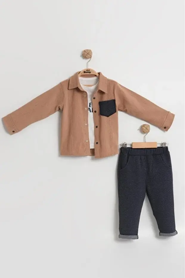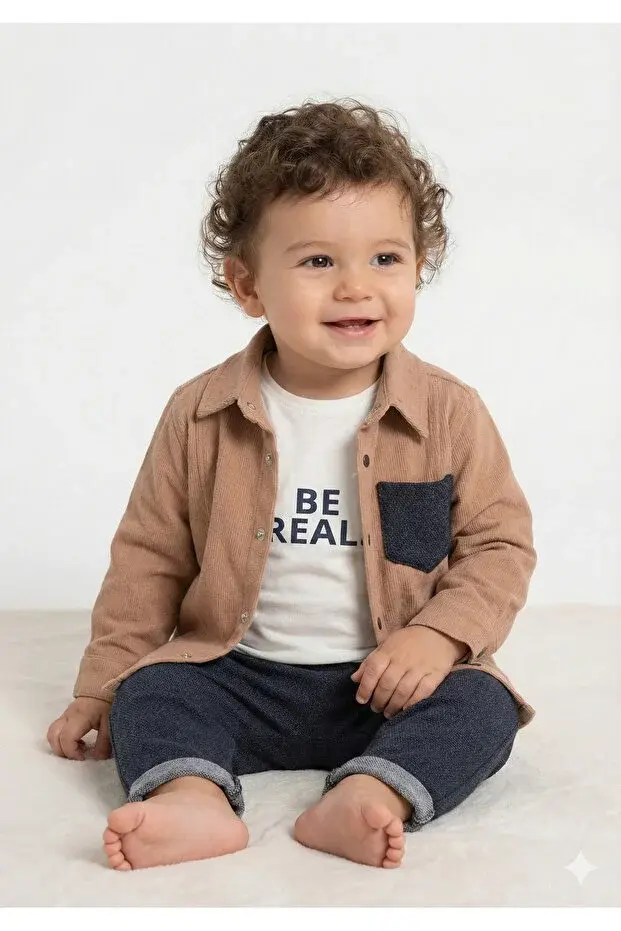 Erkek Bebek Kadife Gömlekli 3’lü Takım (9-12-18 Ay) - Pamuklu & Renk Seçenekli Seri - 1051-krem