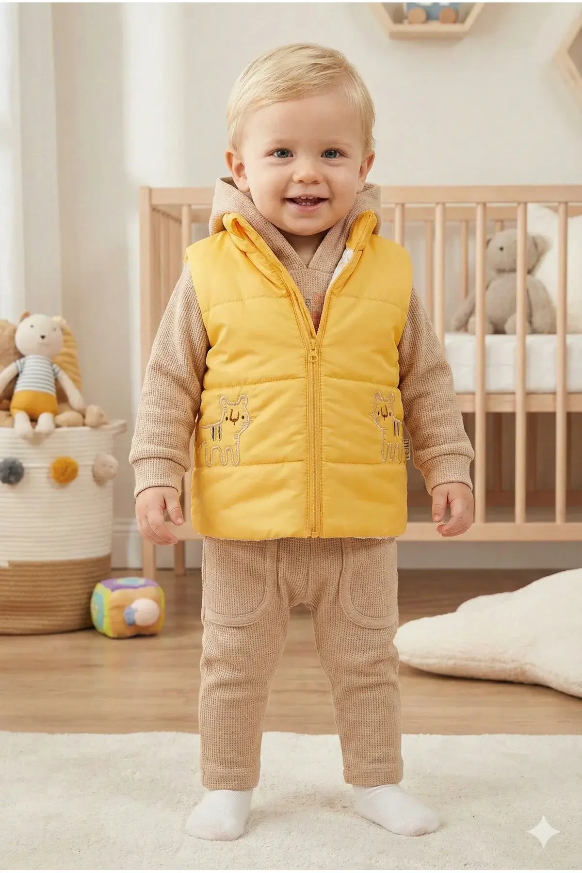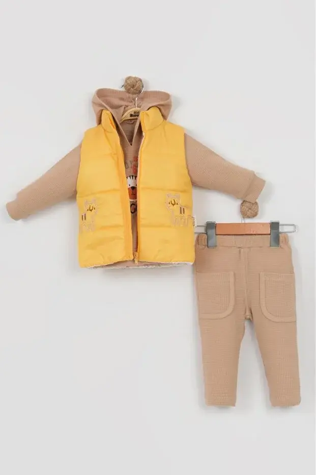 Erkek Bebek Kaplan Desenli Şişme Yelekli 3’lü Pamuk Takım (9-12-18 Ay) - Renkli Seri - 954-Sarı