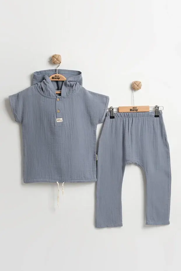 Erkek Bebekler İçin %100 Pamuk Kapüşonlu Mavi Müslin Body Takım (9-12-18 Ay) Seri - 796-Mavi