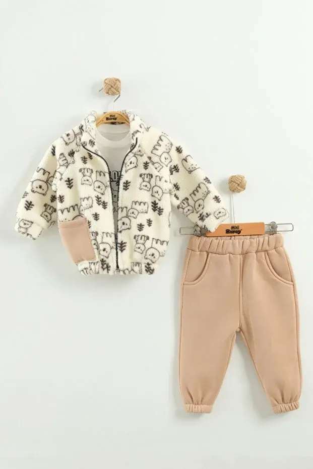 Erkek Çocuk Desenli Mont ve Pantolon 3'lü Takım (9-12-18 Ay) Seri - 1039-Bej