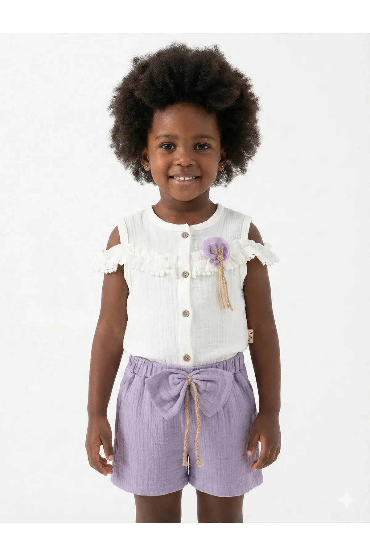 Fırfır Detaylı Müslin Şortlu Kız Takımı - %100 Pamuk Nefes Alabilir - (2-3-4-5 yaş) Seri -931-Mor