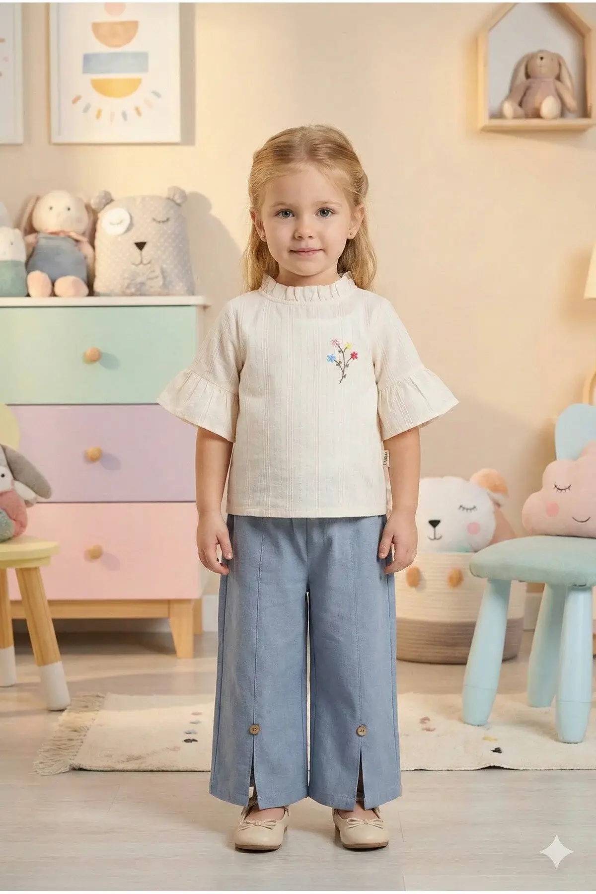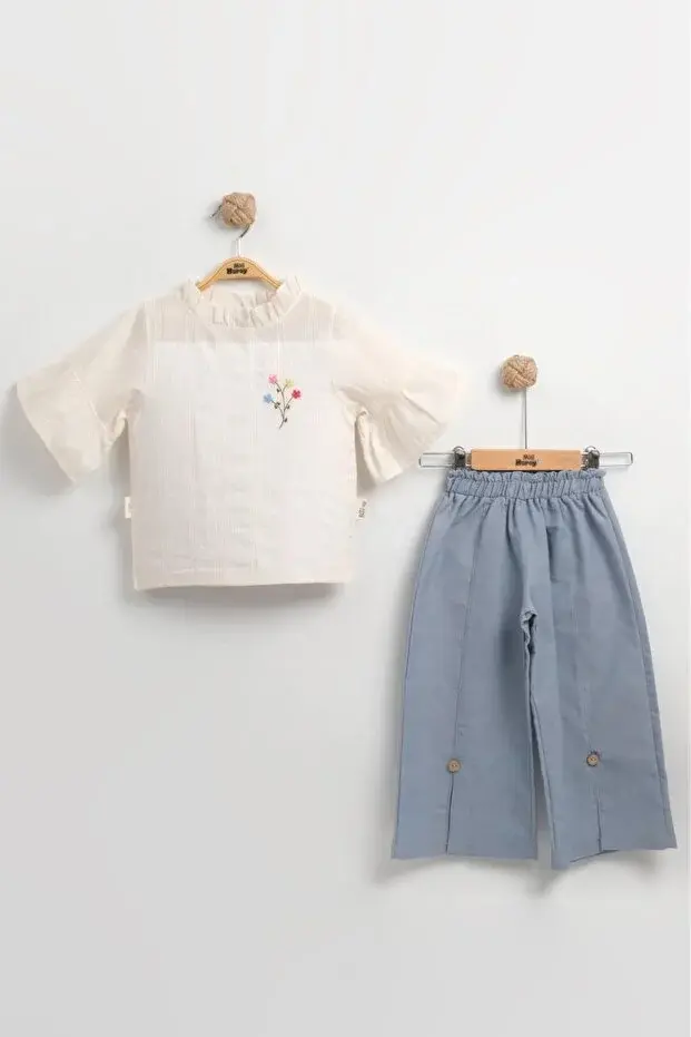 İspanyol Paça Dokuma Gömlekli Kız Çocuk Mavi Yazlık Takım (2-3-4-5 yaş) Seri - 1059-Mavi
