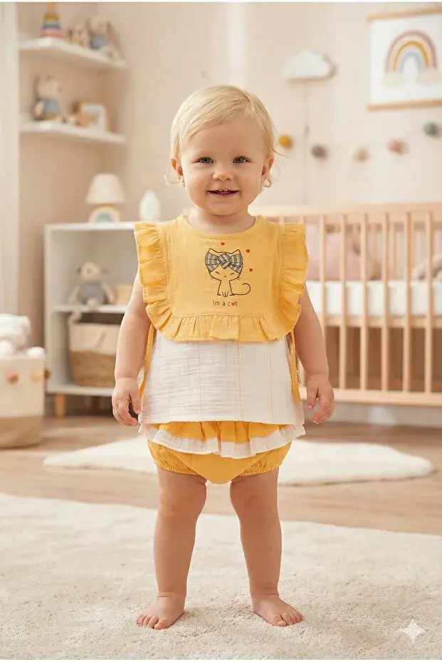 Kilotlu Bolerolu Müslin Kız Yazlık Takım 9-12-18 Ay Seri -985-Sarı