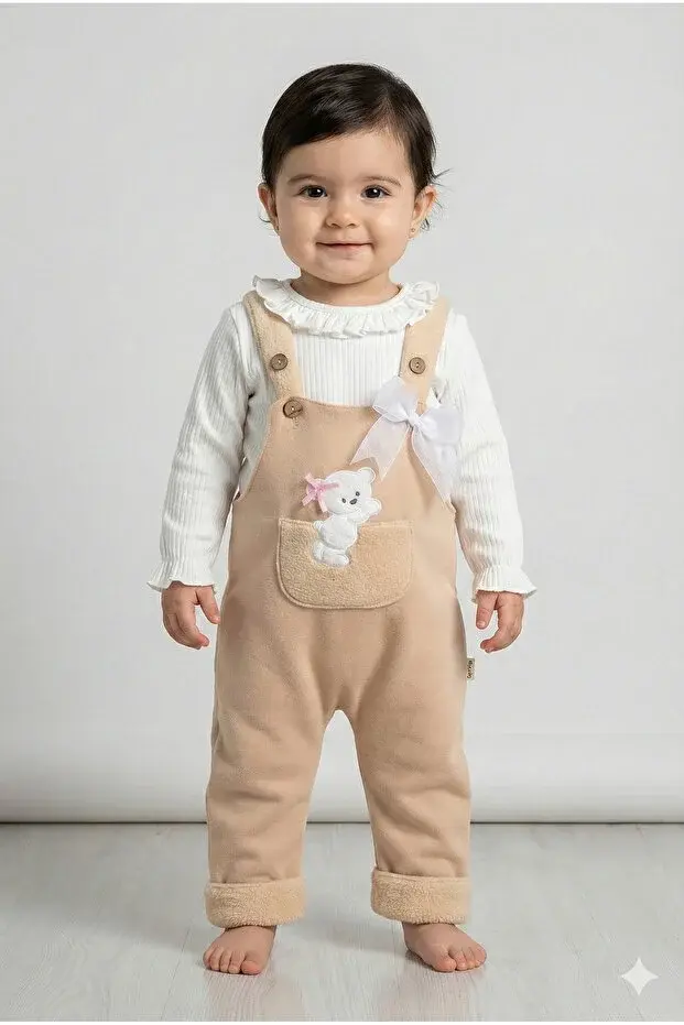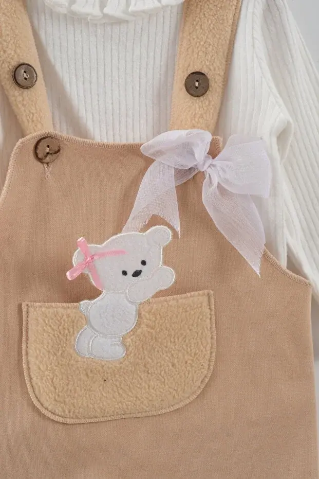 Kız Bebek Ayı Nakış Bej Tulum Takım (9-12-18 Ay) Seri - 891-Bej