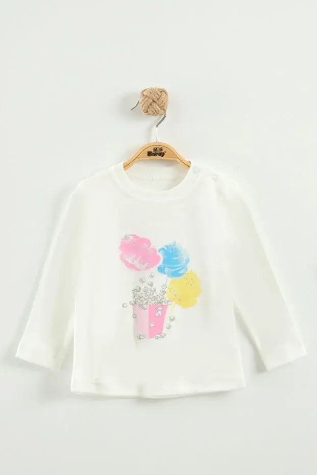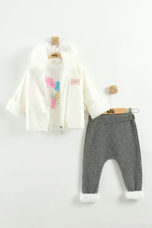 Kız Bebek Baskılı Sweatshirt, Pantolon ve Ceket 3'lü Takım (9-12-18 Ay) Seri -1019-Beyaz