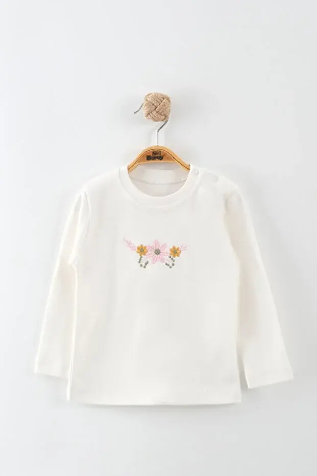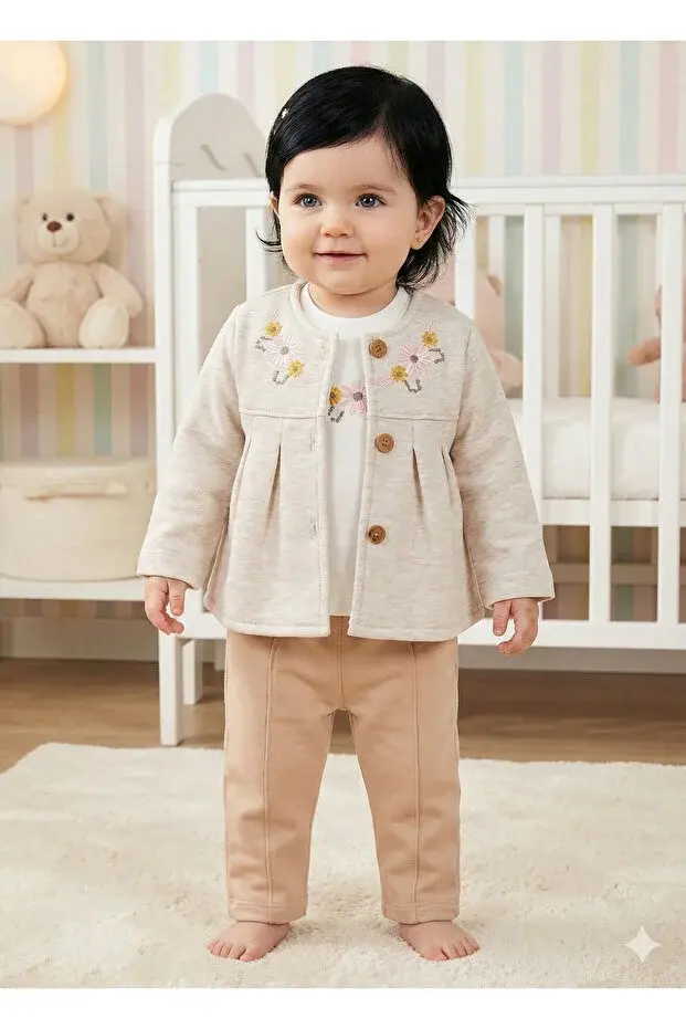 Kız Bebek Çiçek Nakış 3'lü Takım (9-12-18 Ay) Seri - 1092-Bej