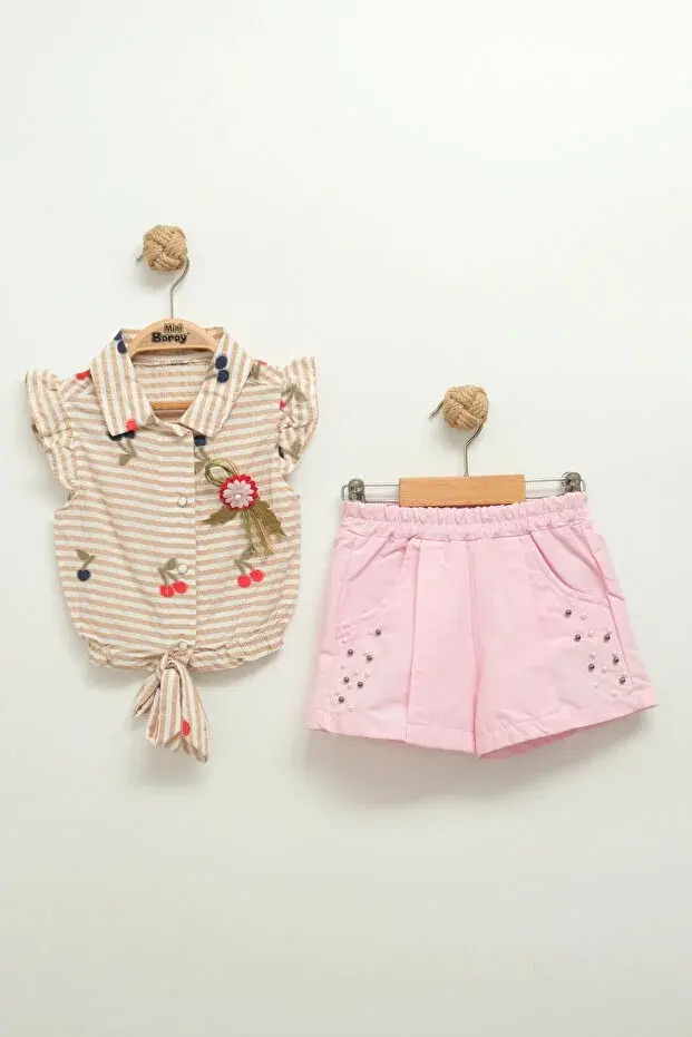 Kız Bebek Çizgili Bluz ve Şort Takımı (9-12-18 Ay) Seri - 802-Bej