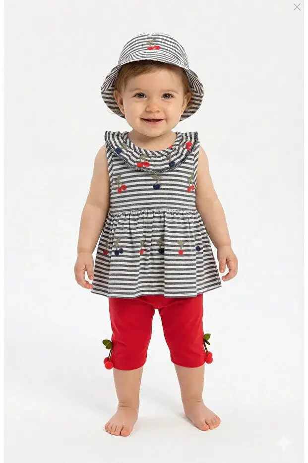Kız Bebek Çizgili Elbise ve Pantolon Takım (Şapkalı) (9-12-18 Ay) Seri -937-Gri