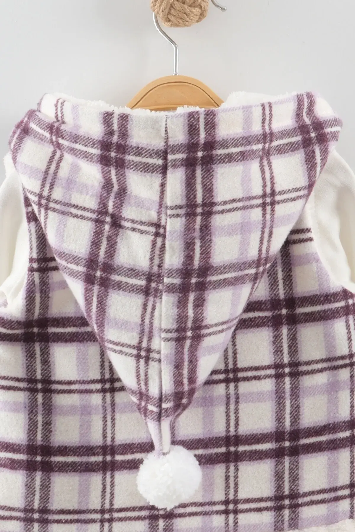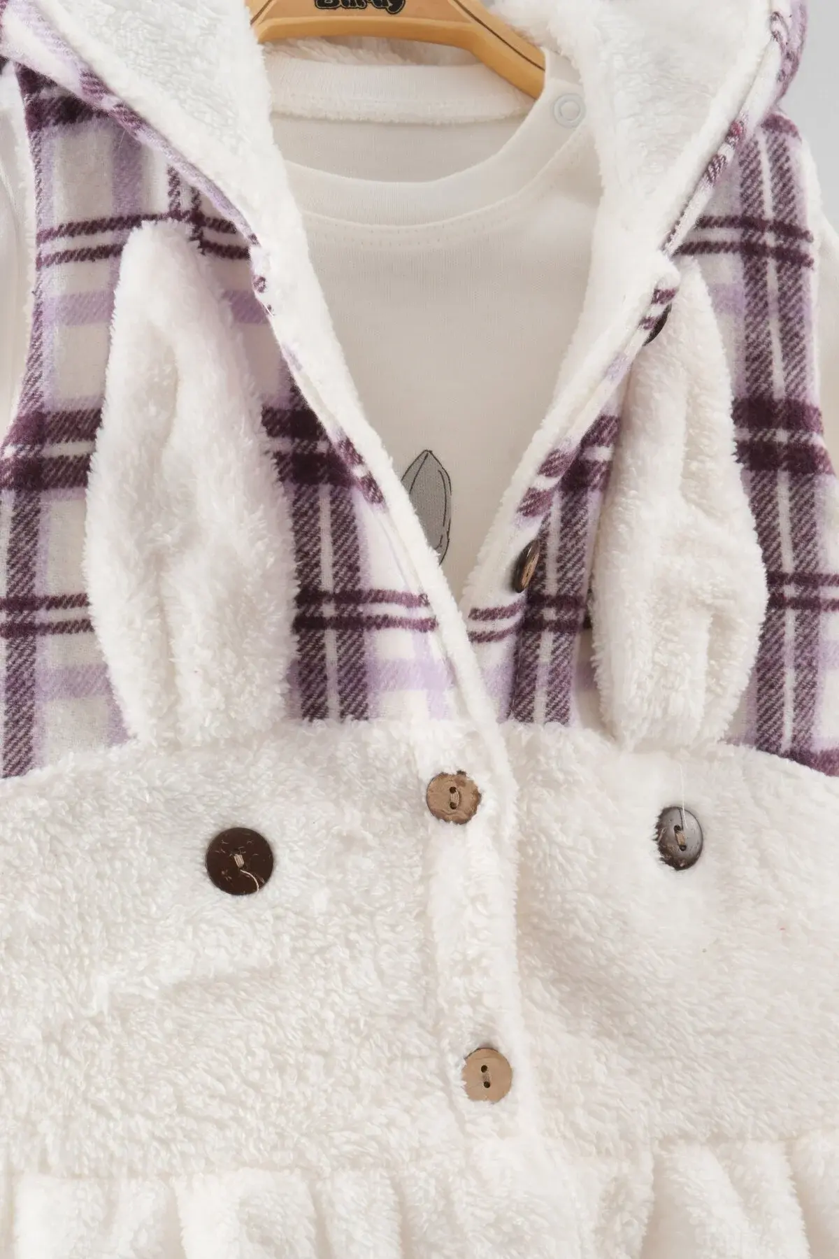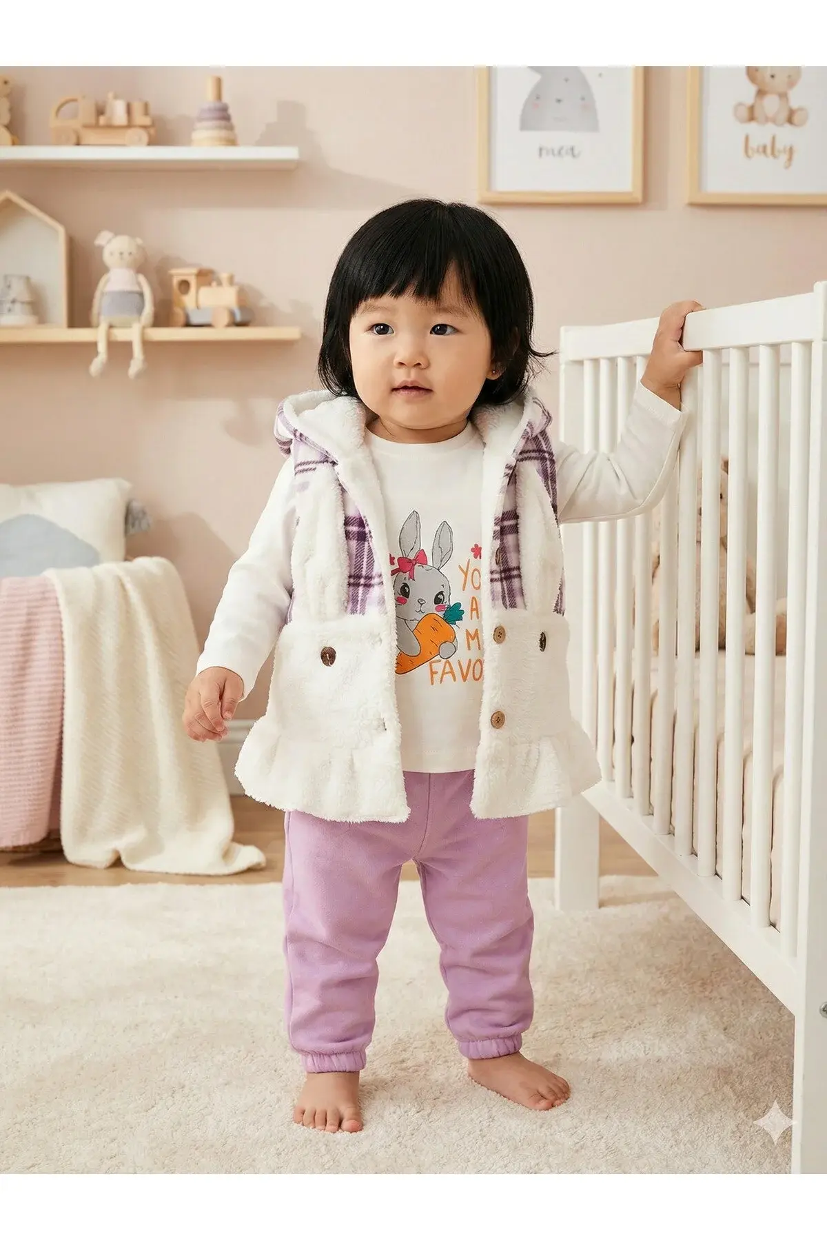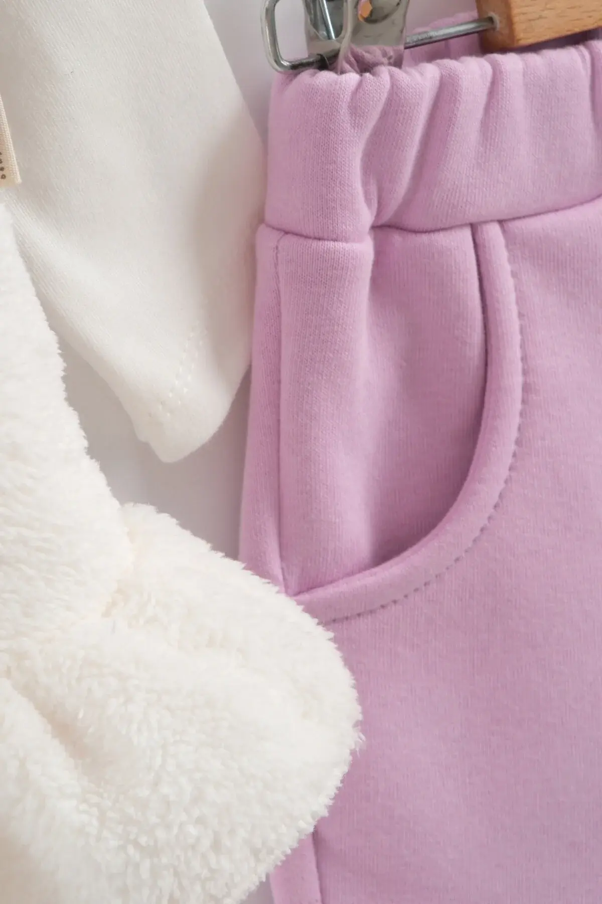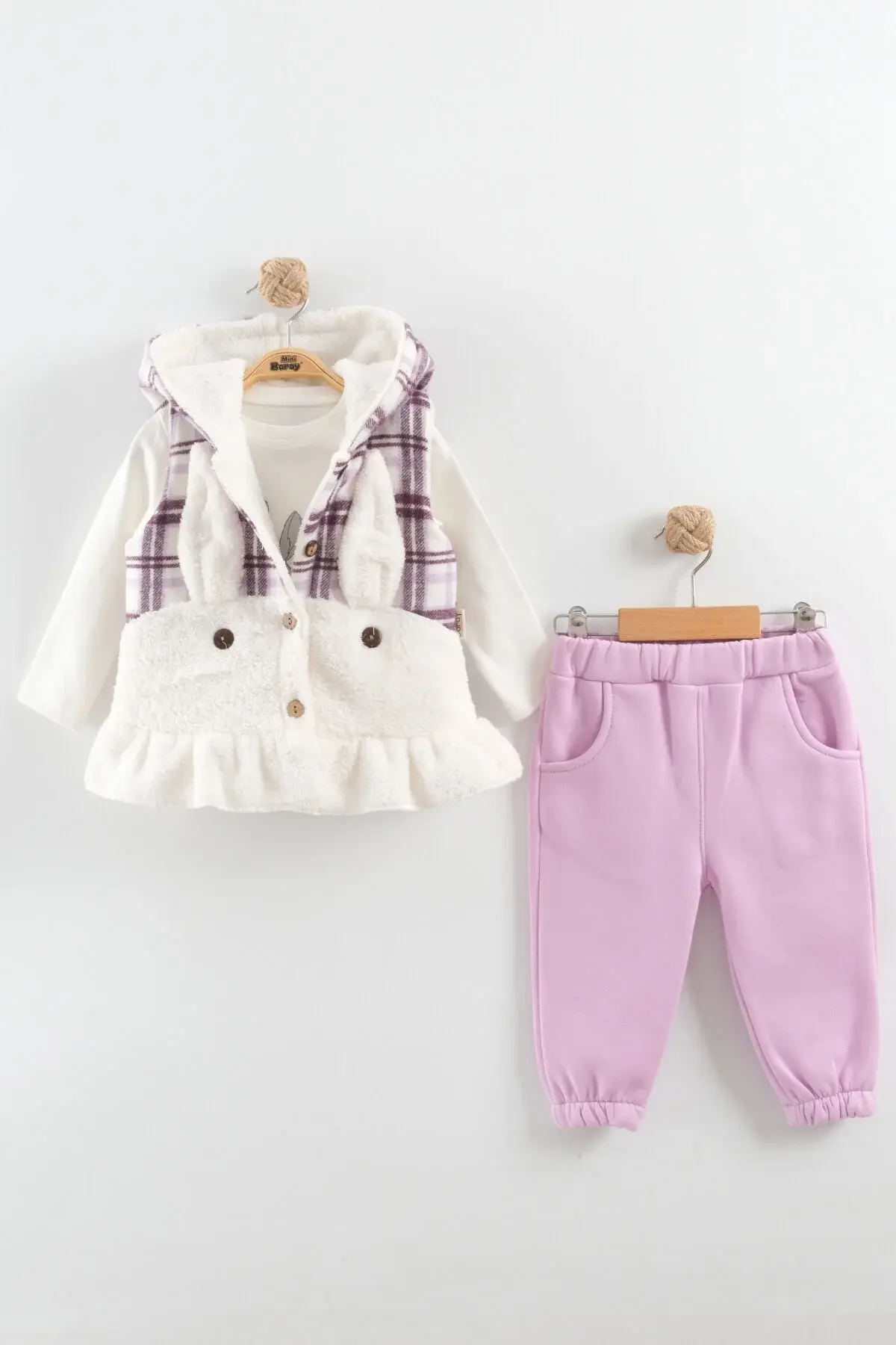 Kız Bebek Düğmeli Peluş Eşofman Mor 3'lü Takım (9-12-18 Ay) Seri - 1088-Mor