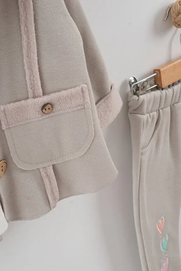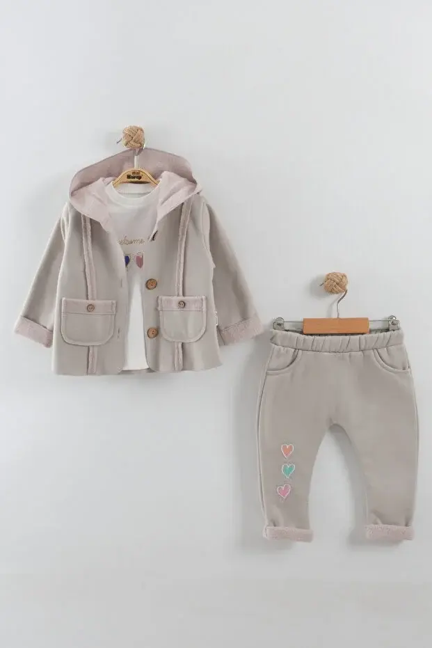 Kız Bebek Kalp Nakışlı 3'lü Eşofman Takım (9-12-18 Ay) Seri - 889-Gri