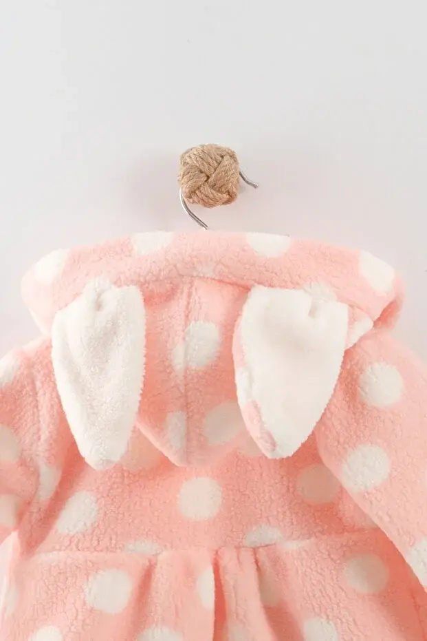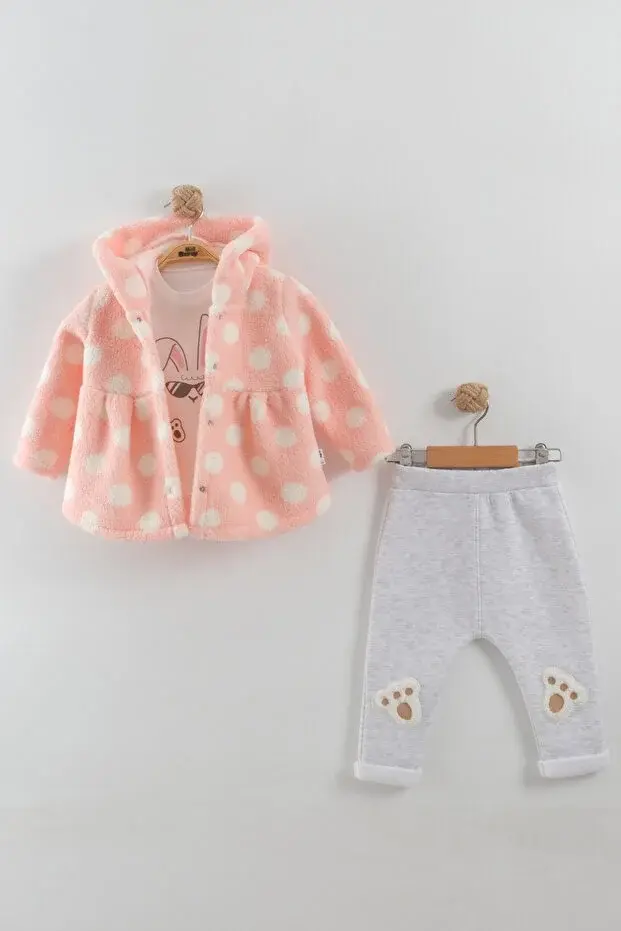 Kız Bebek Peluş Kaban Tavşan Ayak Nakışlı 3'lü Eşofman Takım (9-12-18 Ay) Seri - 895-Somon Pembe