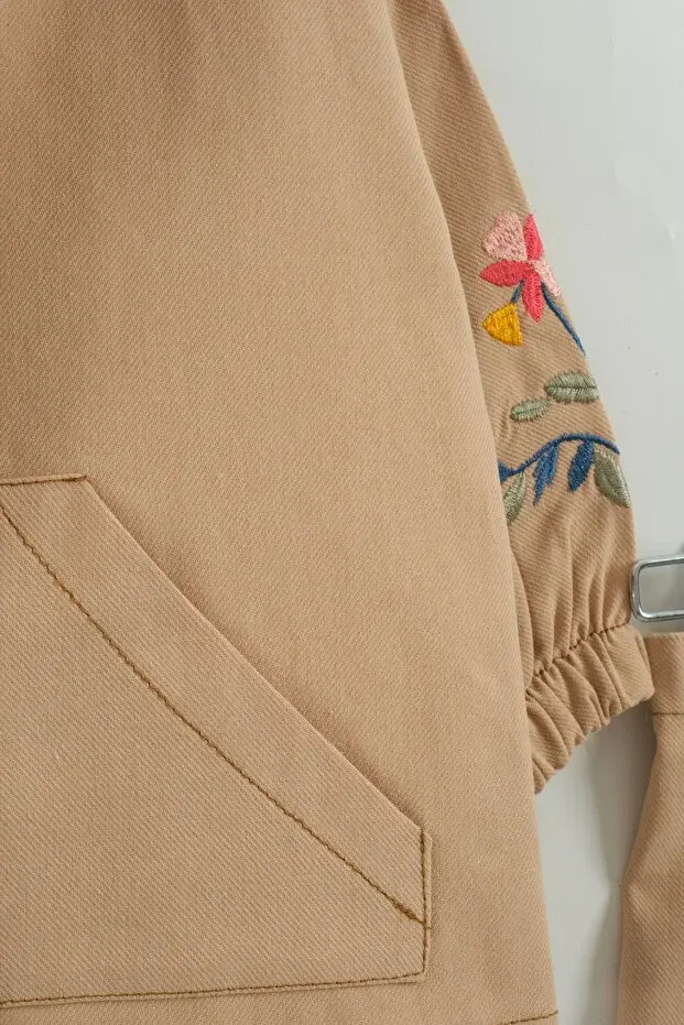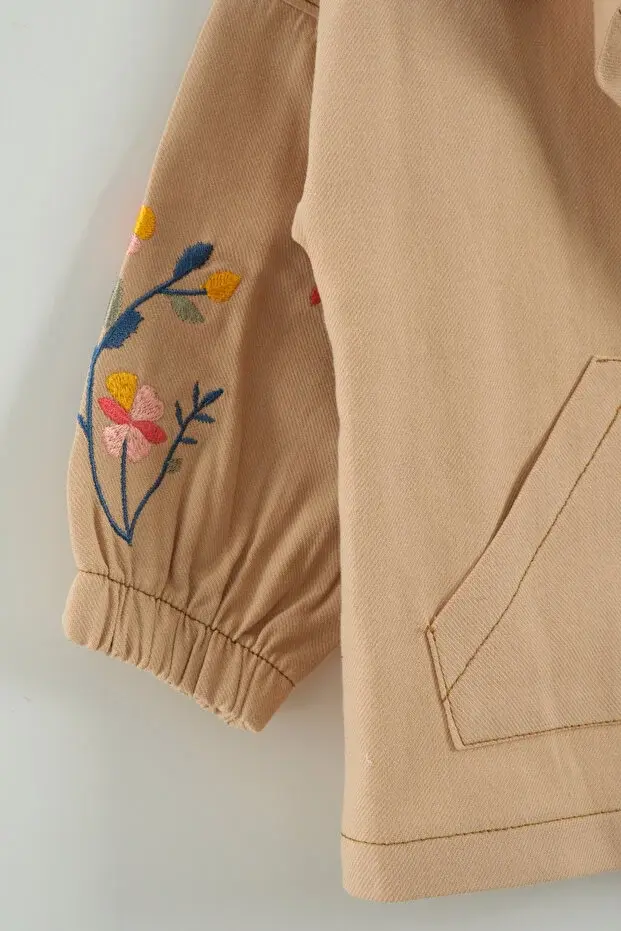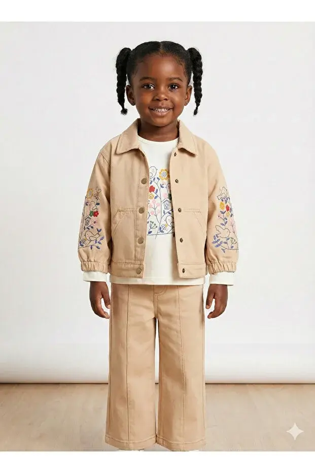 Kız Çocuk Çiçek Nakışlı Ceket ve Pantolon 3'lü Takım (2-3-4-5 Yaş) Seri -1082-Krem