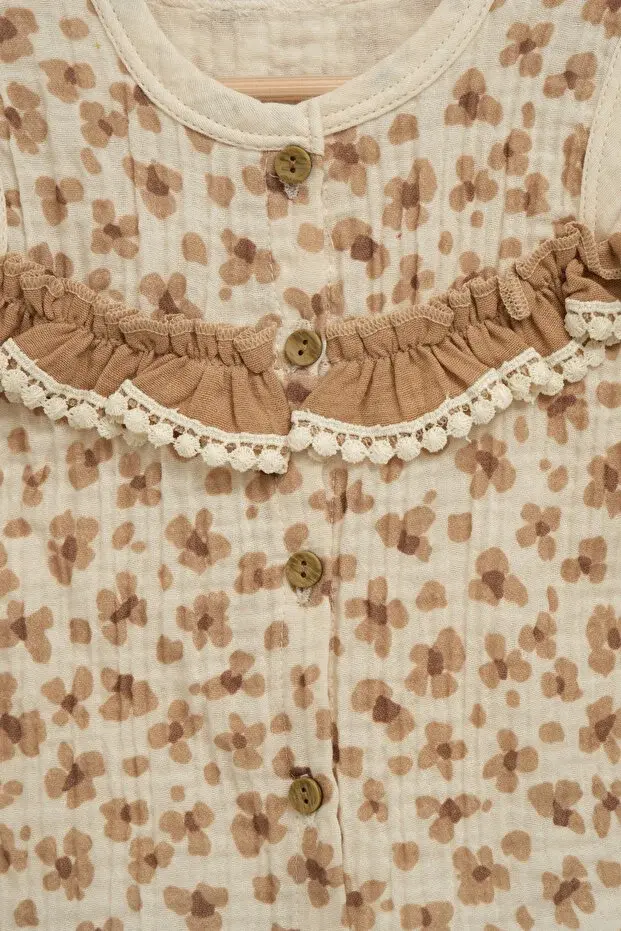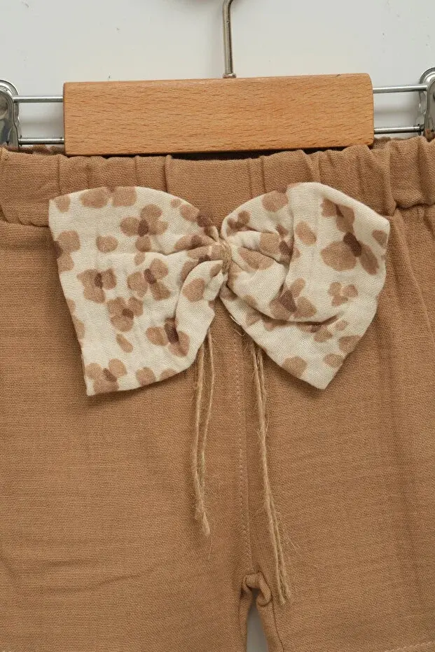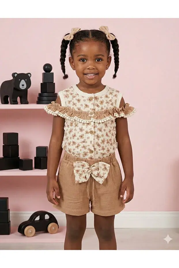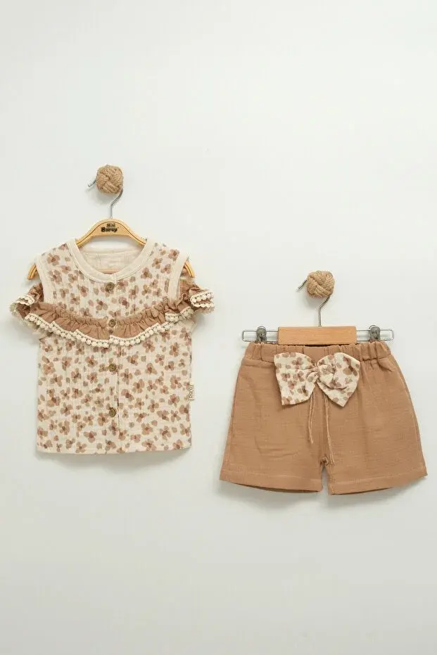 Kız Çocuk Çiçekli Bluz ve Fiyonklu Şort Takım (2-3-4-5 Yaş) Seri -1078-Bej
