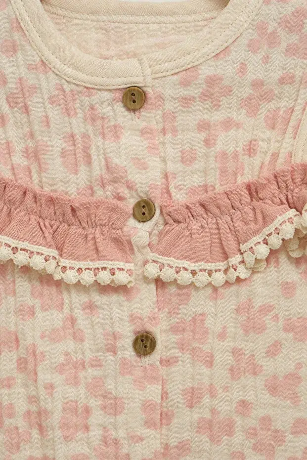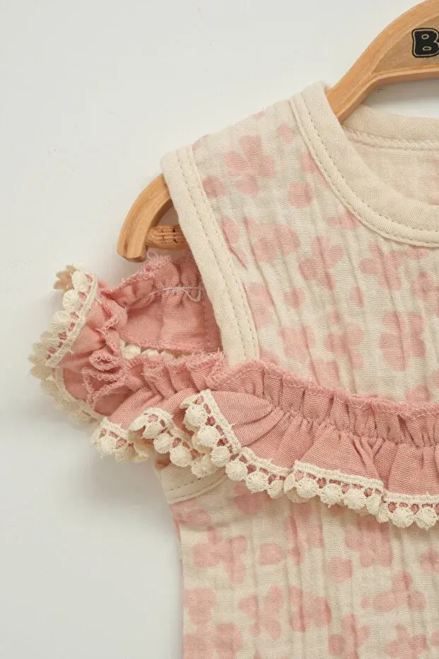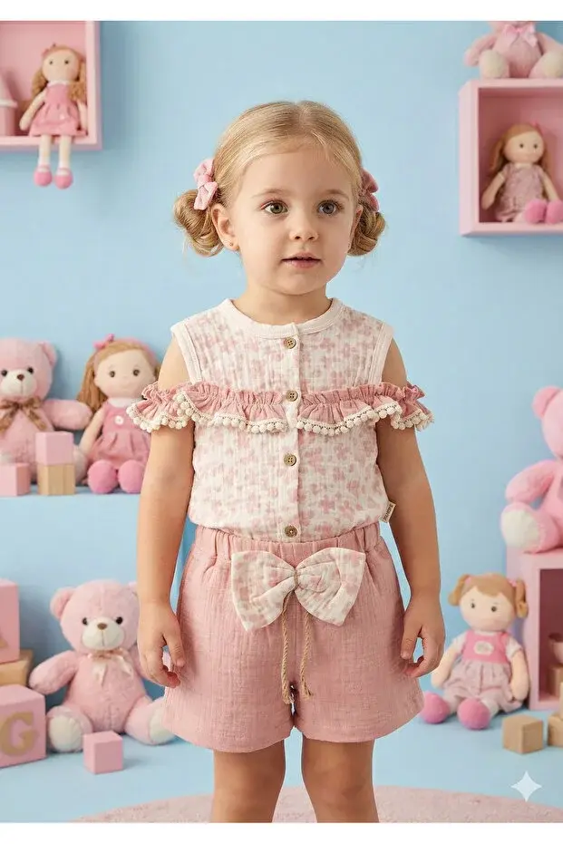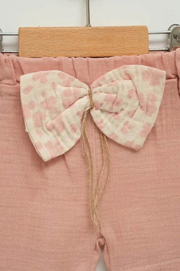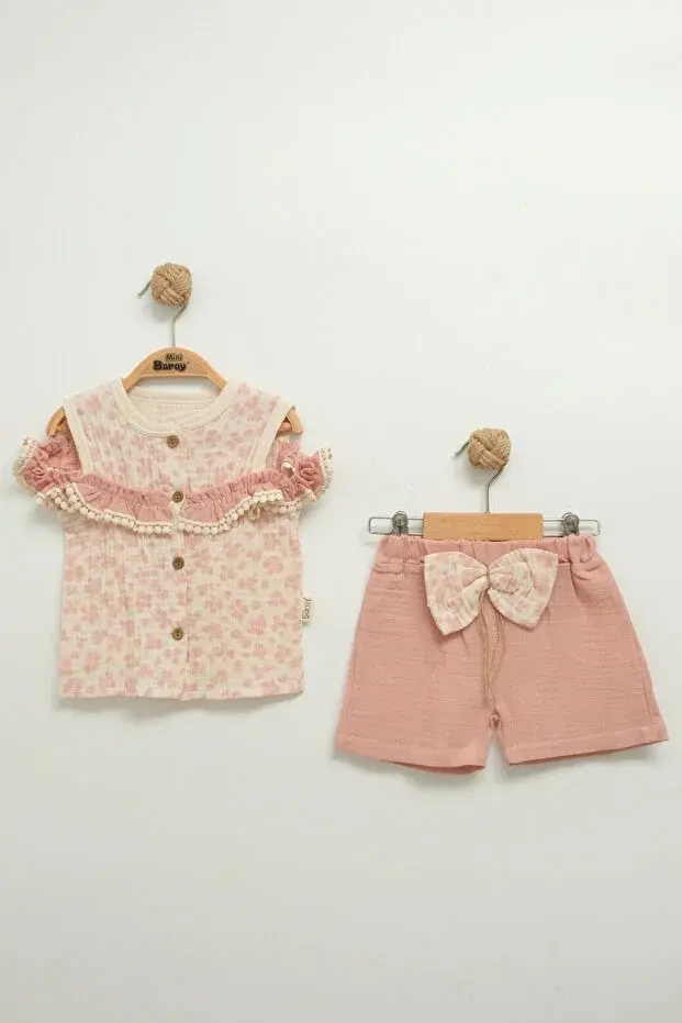 Kız Çocuk Çiçekli Bluz ve Fiyonklu Şort Takım (2-3-4-5 Yaş) Seri -1078-Gülkurusu
