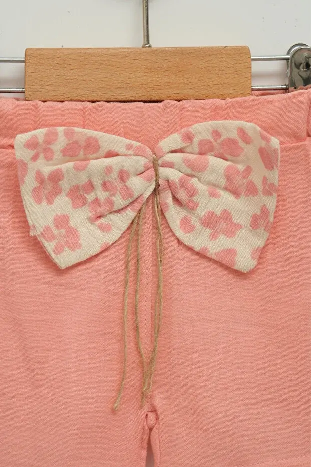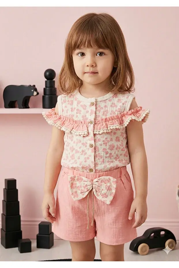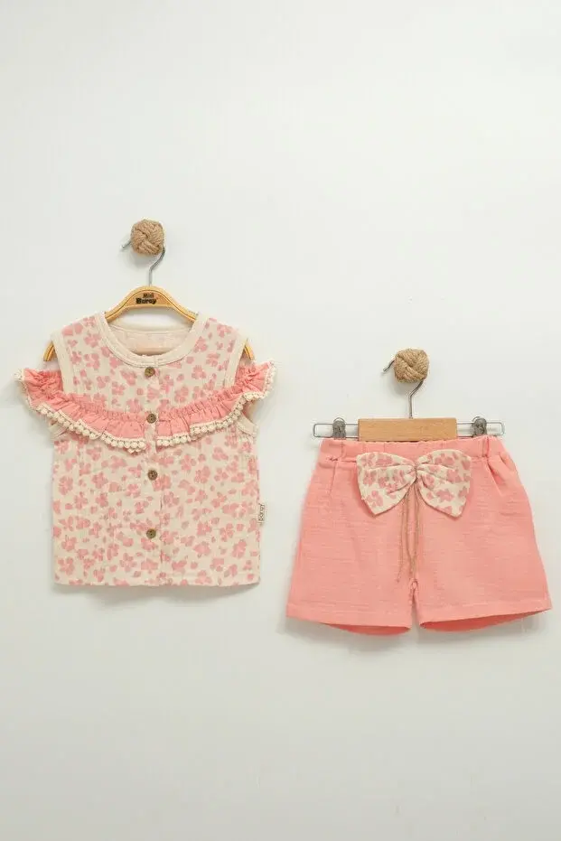 Kız Çocuk Çiçekli Bluz ve Fiyonklu Şort Takım (2-3-4-5 Yaş) Seri -1078-Pembe