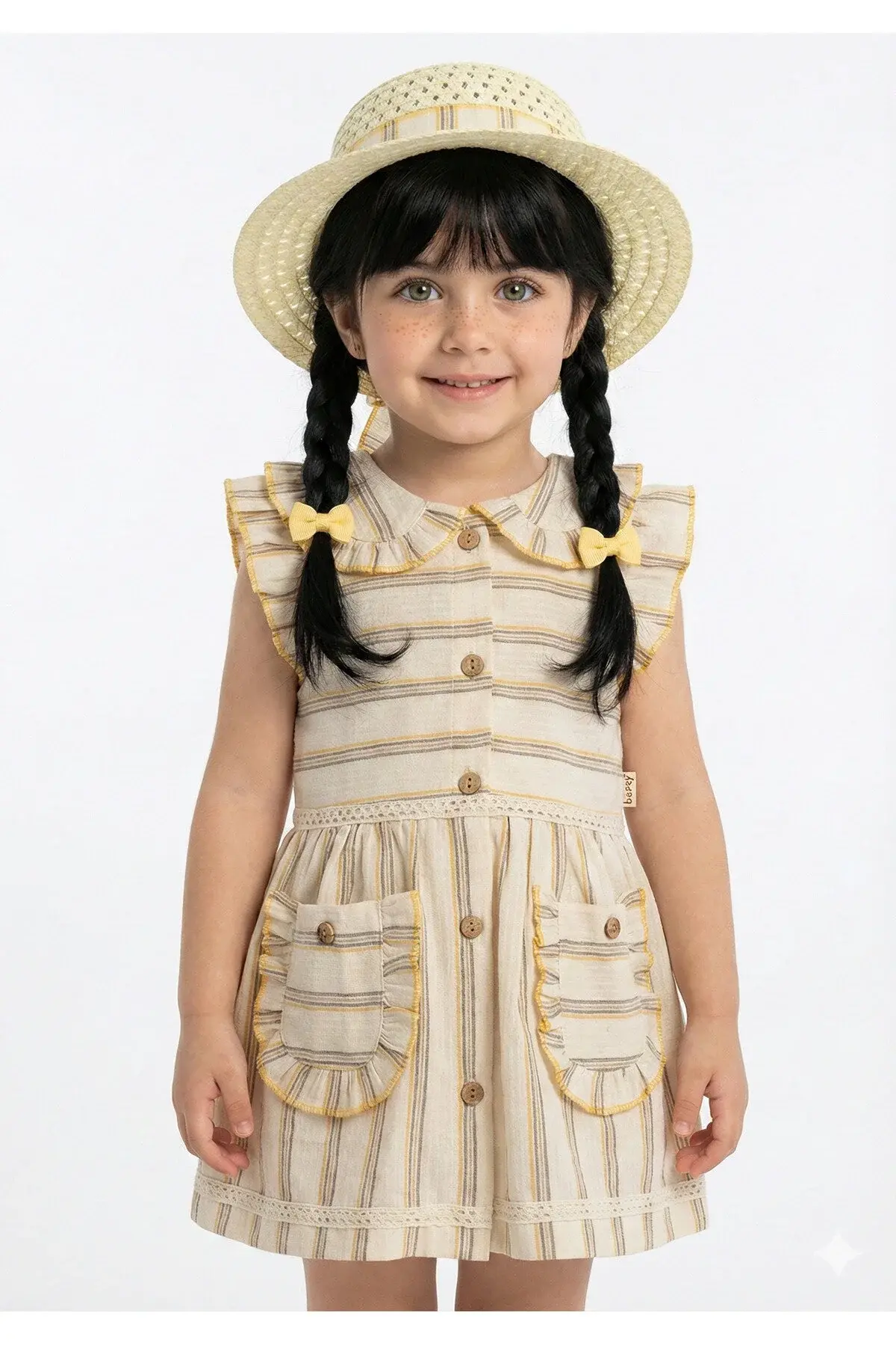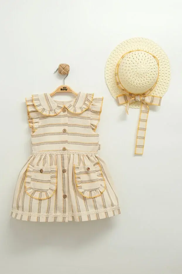 Kız Çocuk Fırfırlı Çizgili Elbise ve Şapka Takımı (1-2-3-4 Yaş) Seri - 1069-Hardal Sarı
