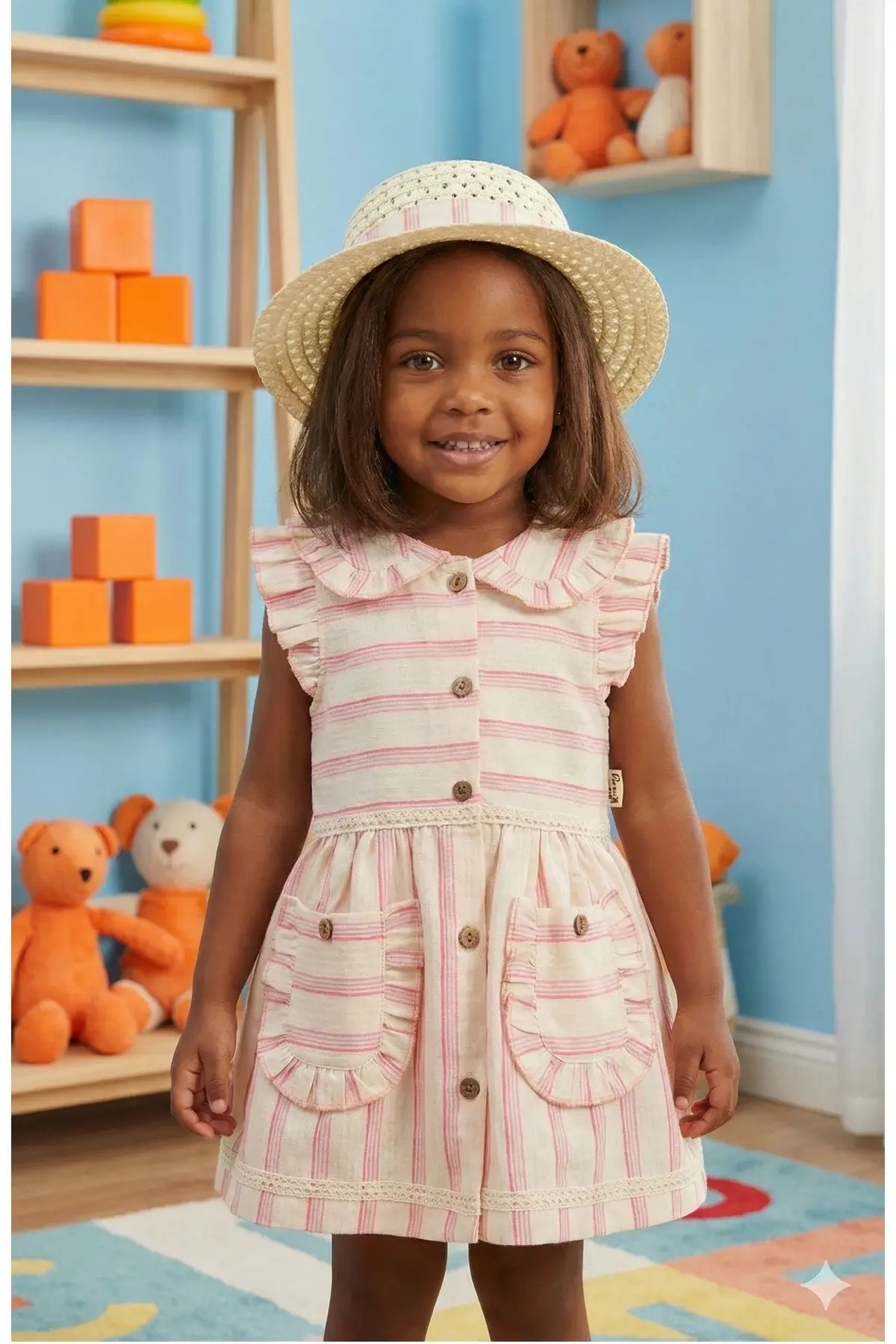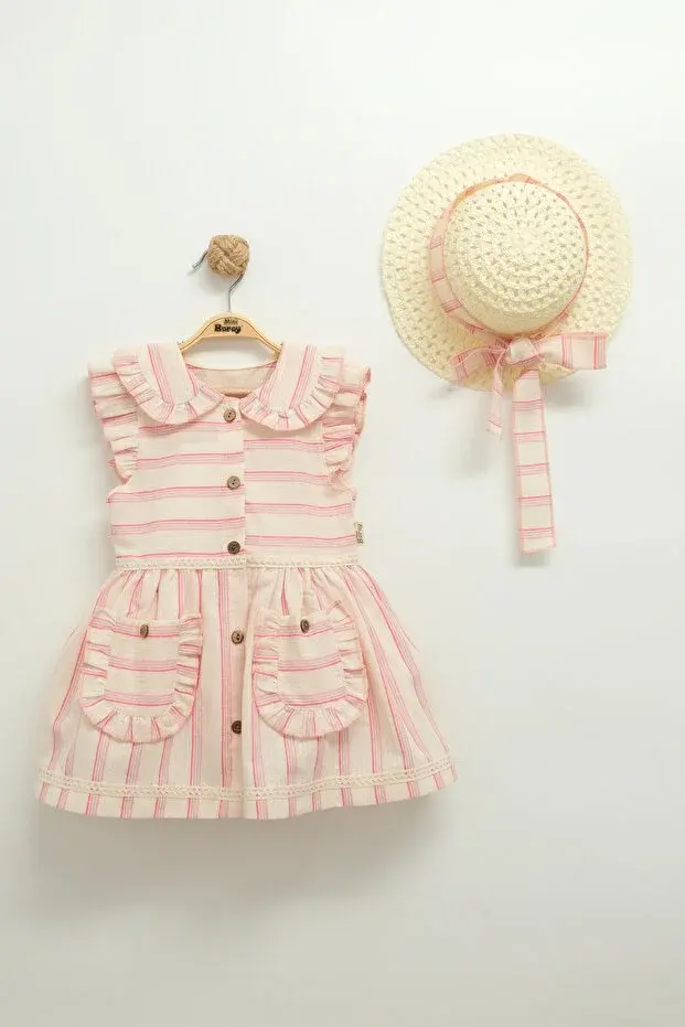 Kız Çocuk Fırfırlı Çizgili Elbise ve Şapka Takımı (1-2-3-4 Yaş) Seri - 1069-Pembe