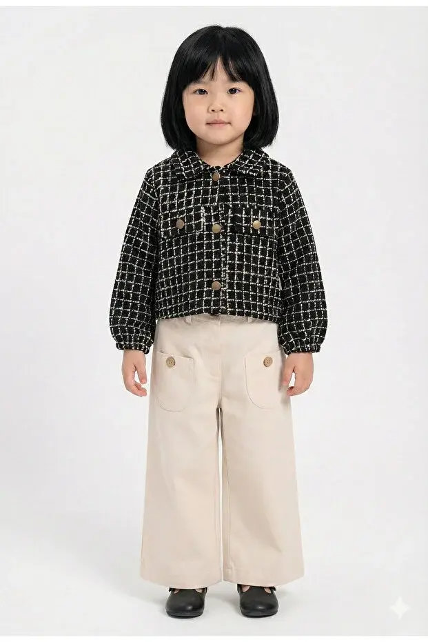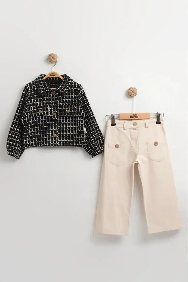 - Rahat hareket etmeyi seven kız çocukları için ideal, geniş paçalı pantolon ve şık ceketten oluşan 2'li takım.