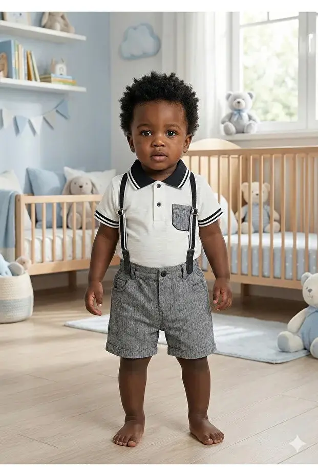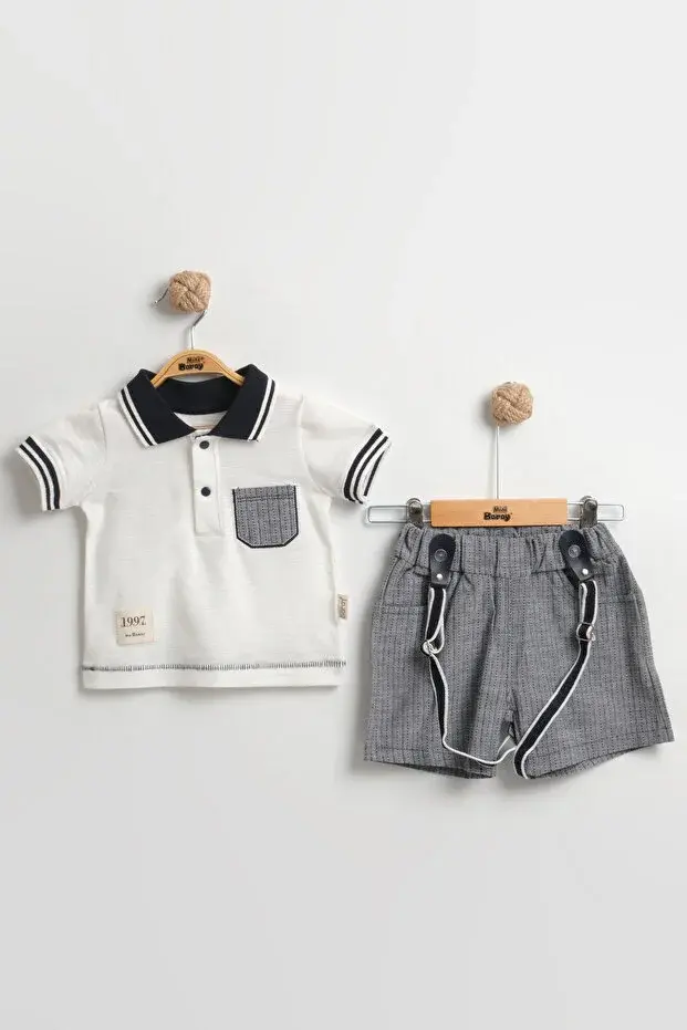 - Erkek bebekler için özel olarak hazırlanmış bu takım, polo yakasıyla modern bir görünüm kazandırırken aynı zamanda sıcak havalarda serin tutar.