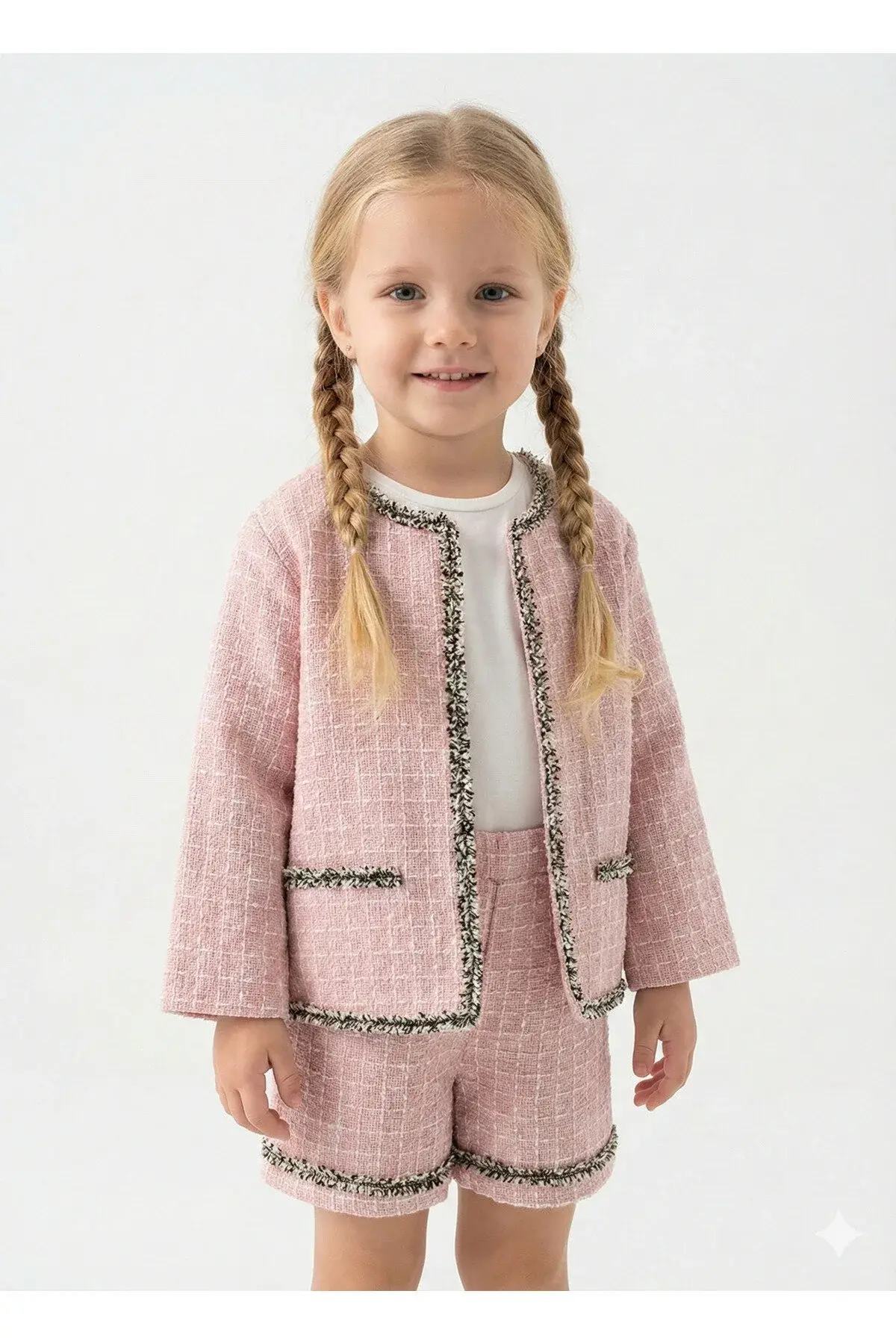 Müslin Ceketli Şortlu Pembe 3'lü Kız Çocuk Takım (2-3-4-5 yaş) Seri - 1052-Pembe