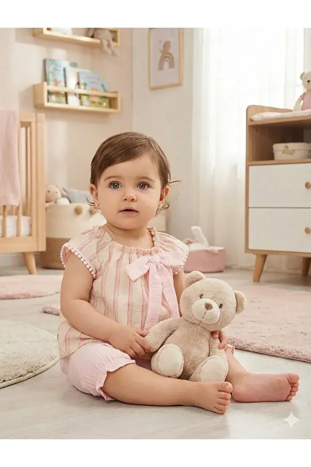 Müslin Fiyonklu Şortlu Çizgili Kız 2 li takım (9-12-18 Ay) Seri -850-Pembe
