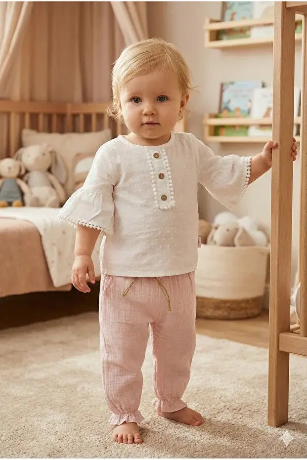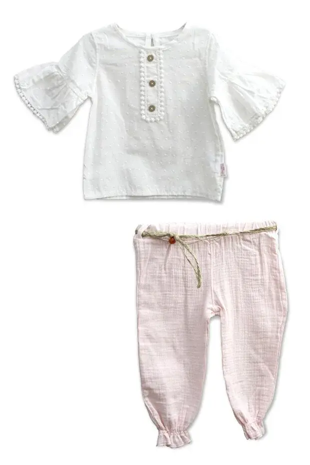Müslin Pantolonlu Kız Takımı Seti (9-12-18 Ay) %100 Pamuk - Rahat Hareket Kolaylığı Seri - 749-Pembe