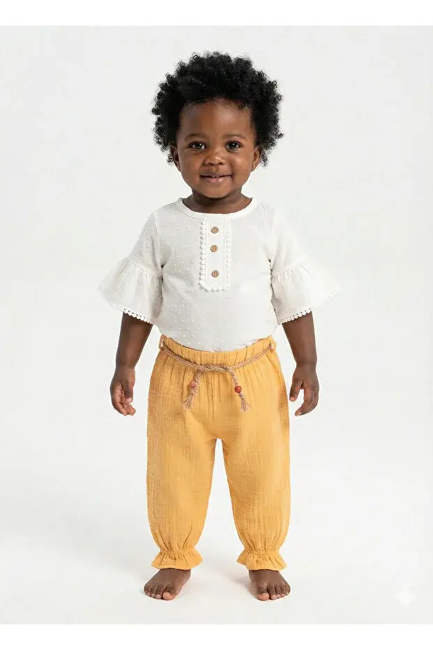Müslin Pantolonlu Kız Takımı Seti (9-12-18 Ay) %100 Pamuk - Rahat Hareket Kolaylığı Seri - 749-Turuncu