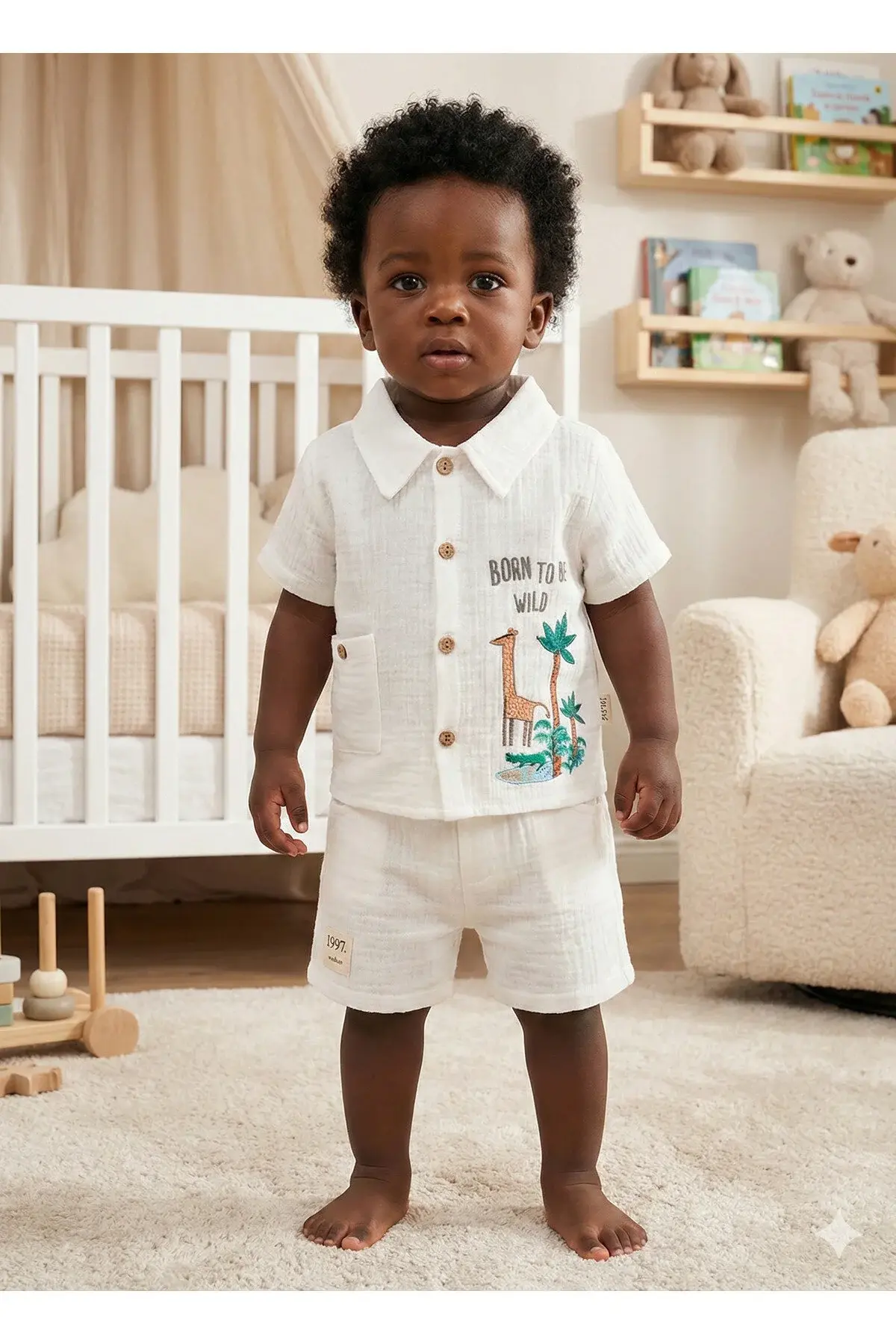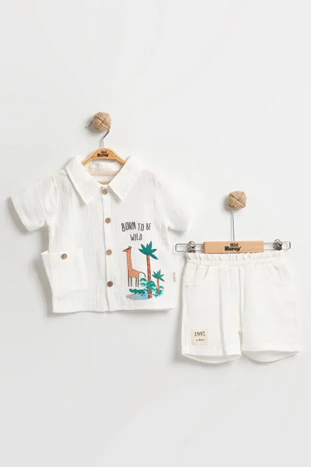 Organik %100 Pamuk Zürafa Baskılı Cepli Erkek Bebek Yazlık Takımı (9-12-18 Ay) - Müslin Kumaş 984-Beyaz