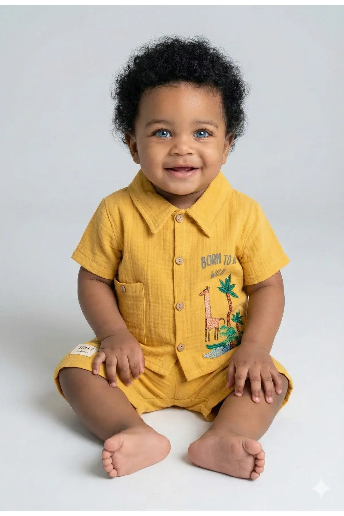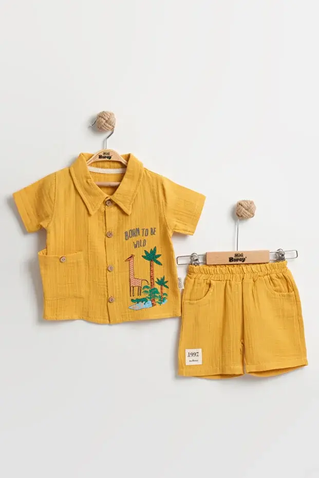 Organik %100 Pamuk Zürafa Baskılı Cepli Erkek Bebek Yazlık Takımı (9-12-18 Ay) - Müslin Kumaş 984-Sarı