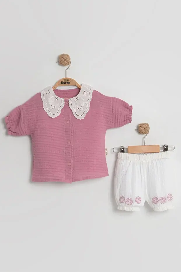 Organik Pamuk Dantel Yakalı Gömlek & Şort Takımı - (9-12-18 Ay) Kız Bebek İçin Seri - 1004-Mürdüm
