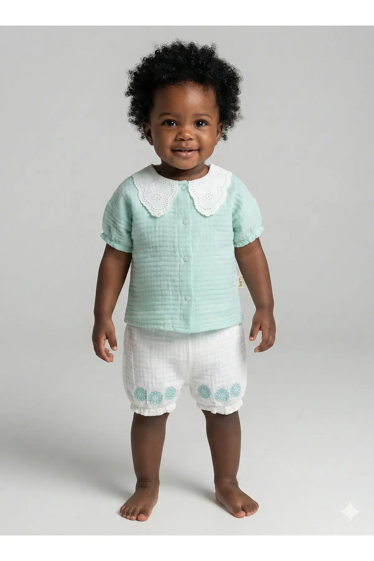 Organik Pamuk Dantel Yakalı Gömlek & Şort Takımı - (9-12-18 Ay) Kız Bebek İçin Seri - 1004-Yeşil