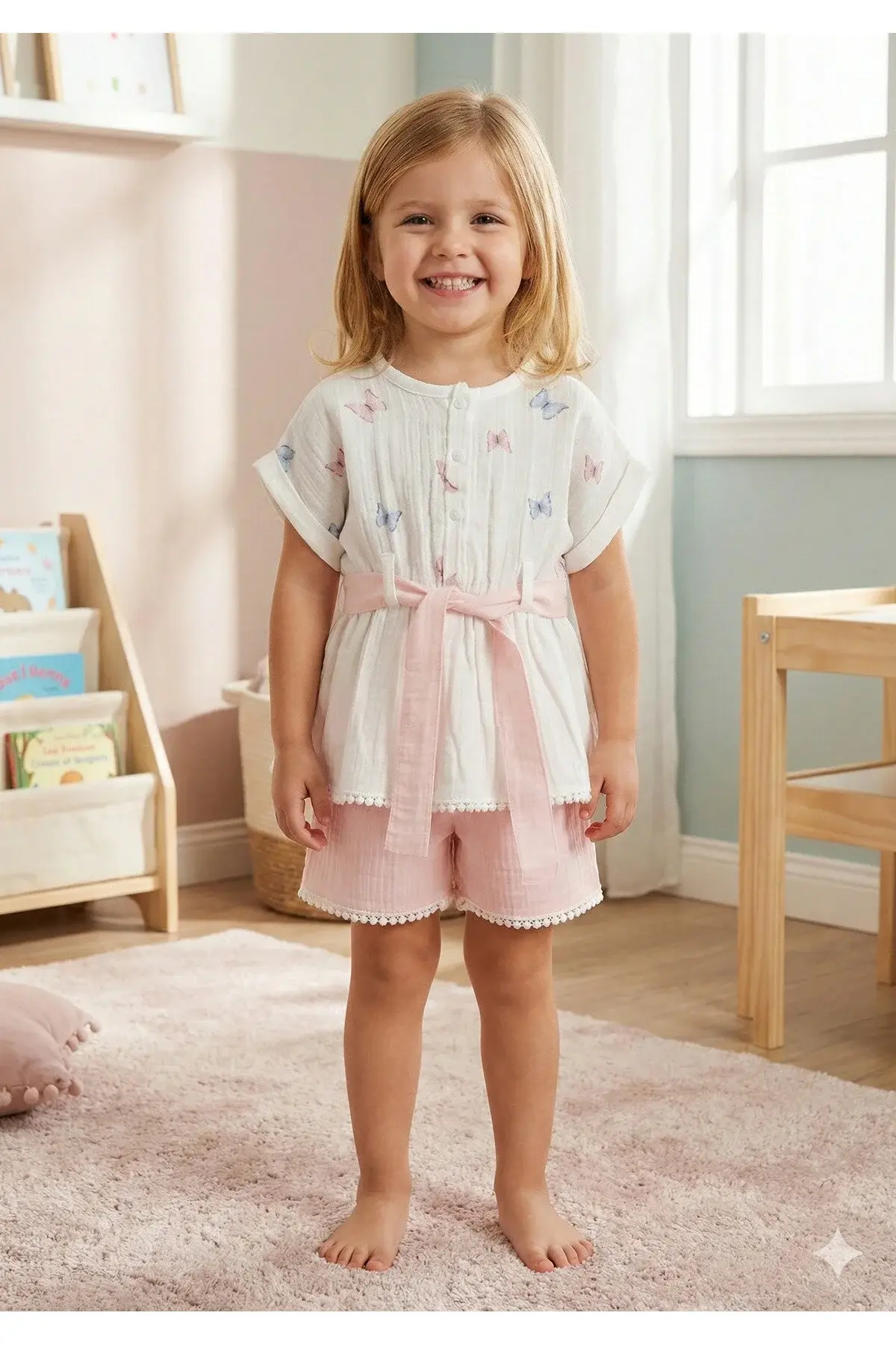 Organik Pamuk Kelebekli Kız Şortlu Takımı (2-3-4-5 yaş) - Nefes Alabilir Yazlık Bebek Kıyafeti Seri - 982-Açık Pembe
