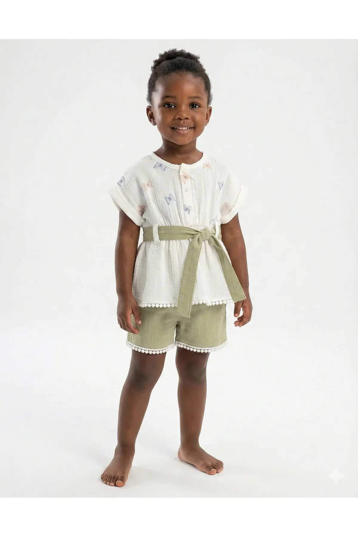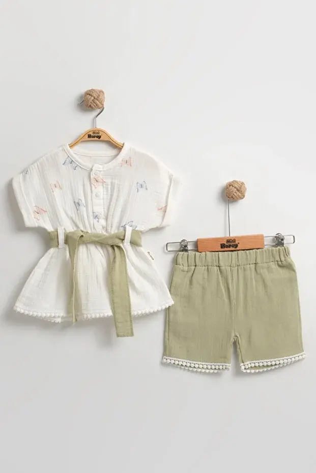 Organik Pamuk Kelebekli Kız Şortlu Takımı (2-3-4-5 yaş) - Nefes Alabilir Yazlık Bebek Kıyafeti Seri - 982-Yeşil