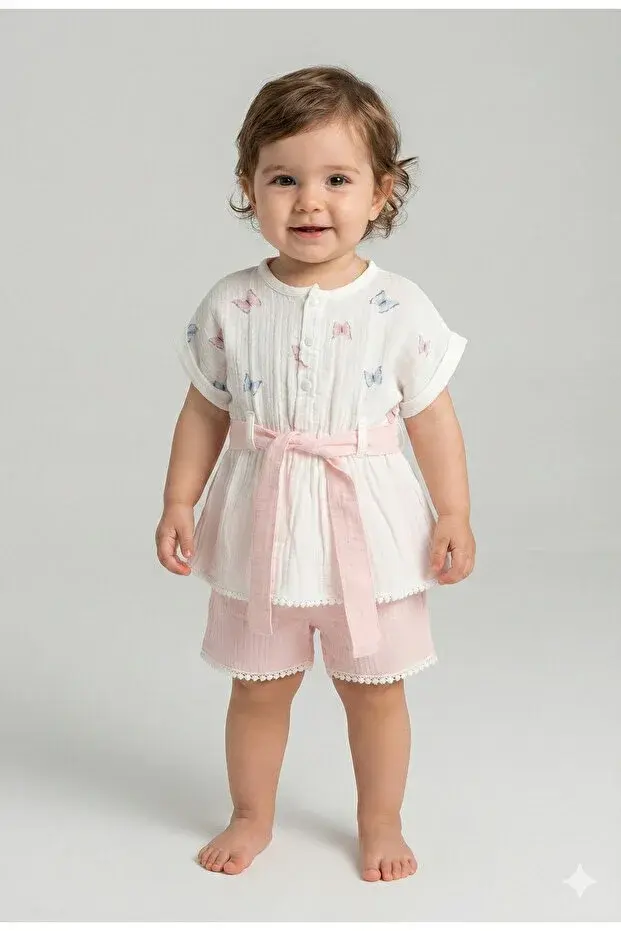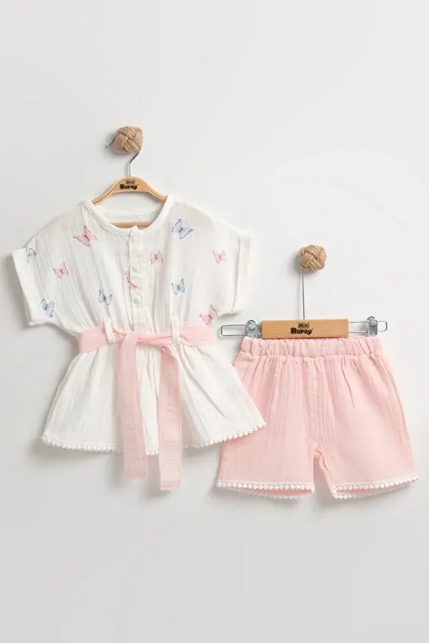 Organik Pamuk Kelebekli Kız Şortlu Takımı (9-12-18 Ay) - Nefes Alabilir Yazlık Bebek Kıyafeti Seri - 935-Açık Pembe