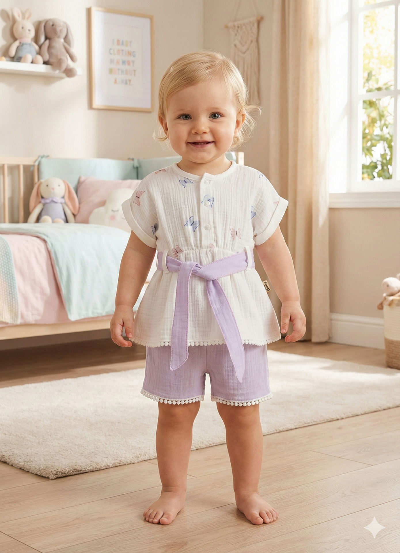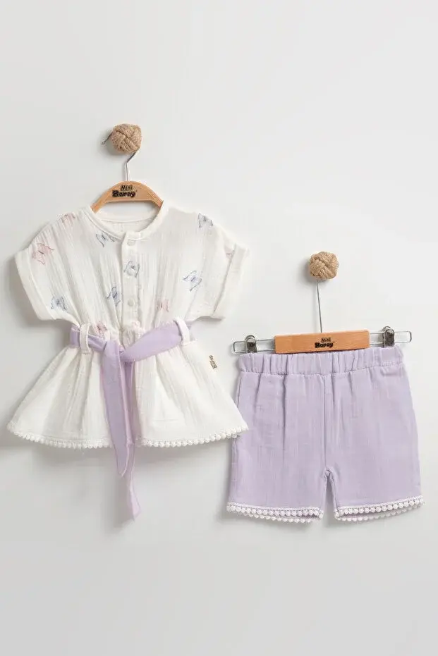 Organik Pamuk Kelebekli Kız Şortlu Takımı (9-12-18 Ay) - Nefes Alabilir Yazlık Bebek Kıyafeti Seri - 935-Mor